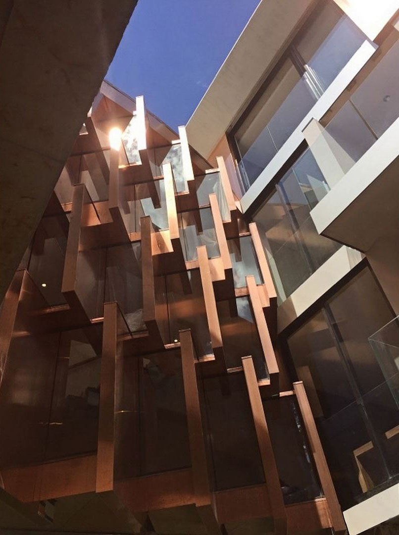 The front pavilion contains bedrooms and amenities. The rear pavilion contains a variety of living spaces. A dramatic double height space in the rear pavilion opens to a large deck, sunken conversation pit and waterfall edge pool.