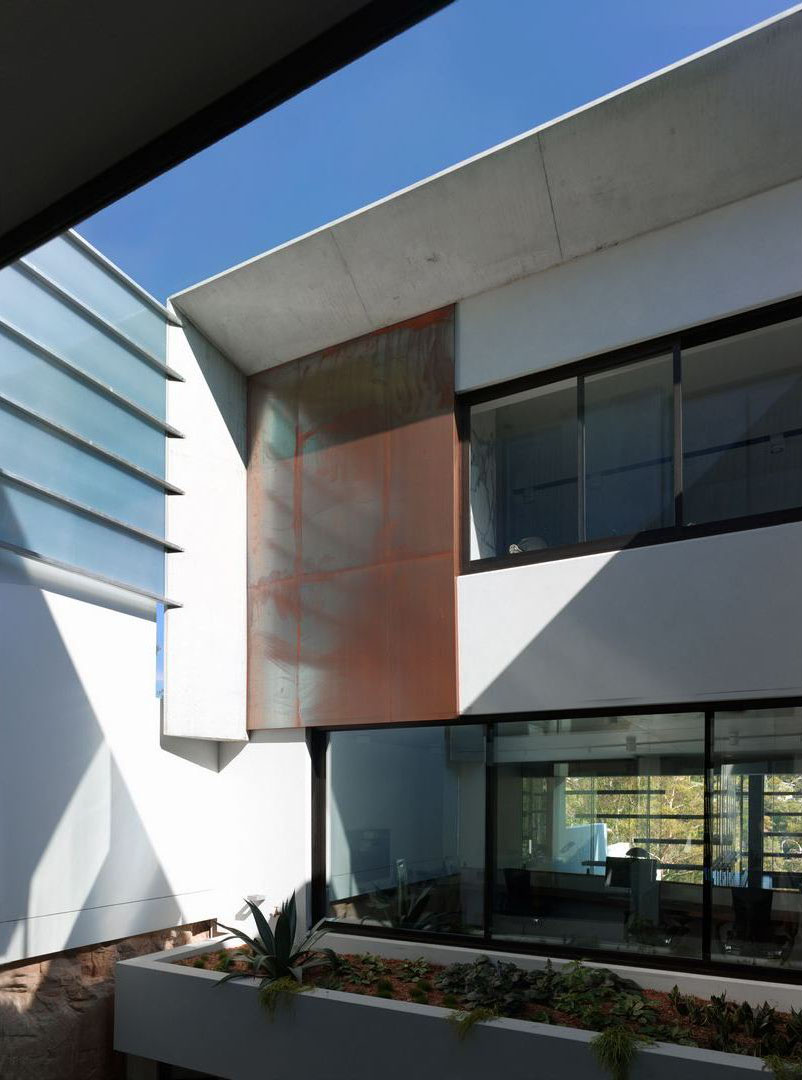Built on a steep site on a quiet street, the house is conceived as two pavilions arranged on each side of a central courtyard which brings in light and is a source of ventilation and cooling.