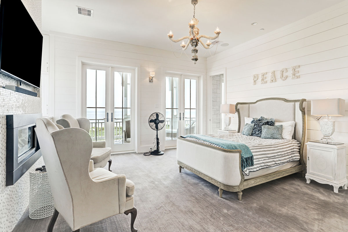 The 5,200-square-foot home has 7 bedrooms, 7.5 bathrooms and an elevator. Guests can enjoy the serene beach vistas on wrap-around porches and balconies.