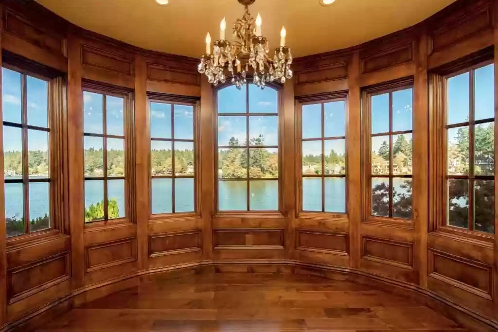 The interior features custom woodwork and Old World elegance. Most of the rooms have a serene vista of Oswego Lake.