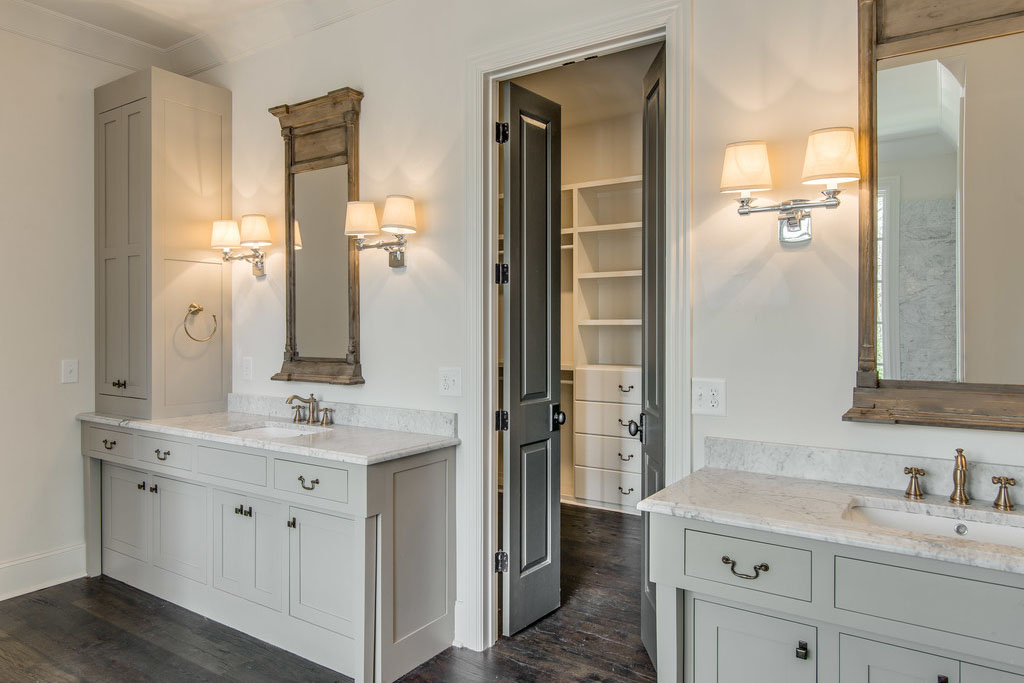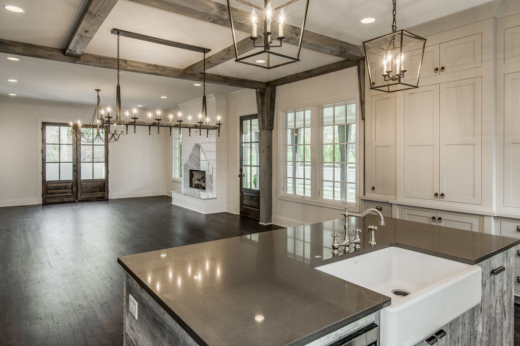 The white painted brick home built by Vintage South Development features a striking exterior with iconic gable roof, decorative parapet wall, black framed windows and second-floor balcony.