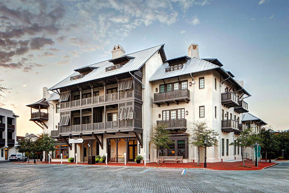 Barrett Place in Rosemary Beach, Florida is a commercial and mixed-use property featuring a solid stucco-on-masonry design with timber-framed porches, reflecting the town’s signature architectural style.
