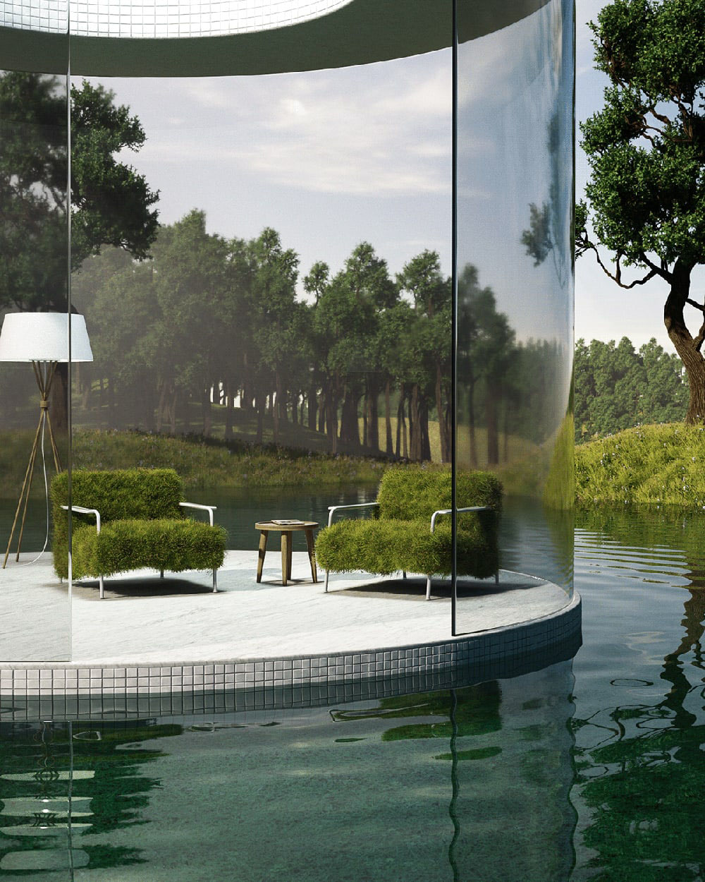 Grass covered version of the “Aero” lounge chairs by Wendelbo are featured in these stunning computer generated images of a round glass island on a pond.