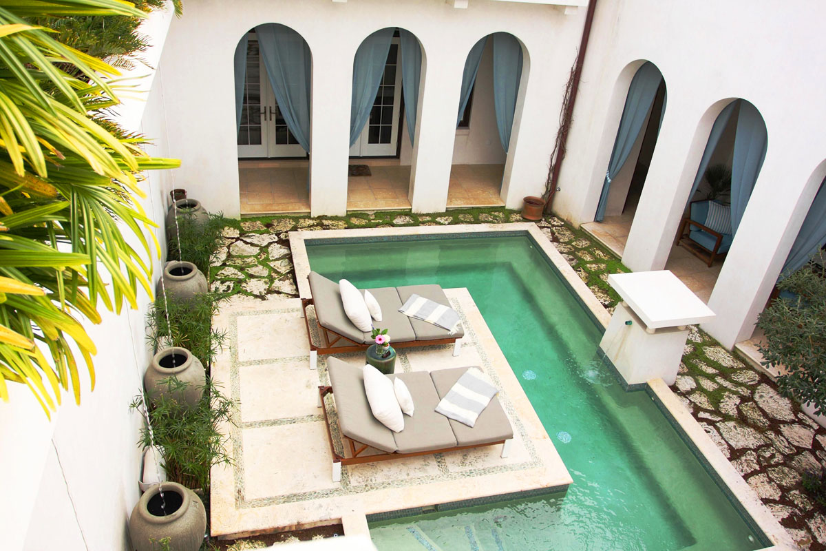 This quiet haven in Alys Beach, Florida offers a private courtyard with a pool. The home is located in the New Urbanist community designed by the world-renowned Duany Plater-Zyberk & Company.
