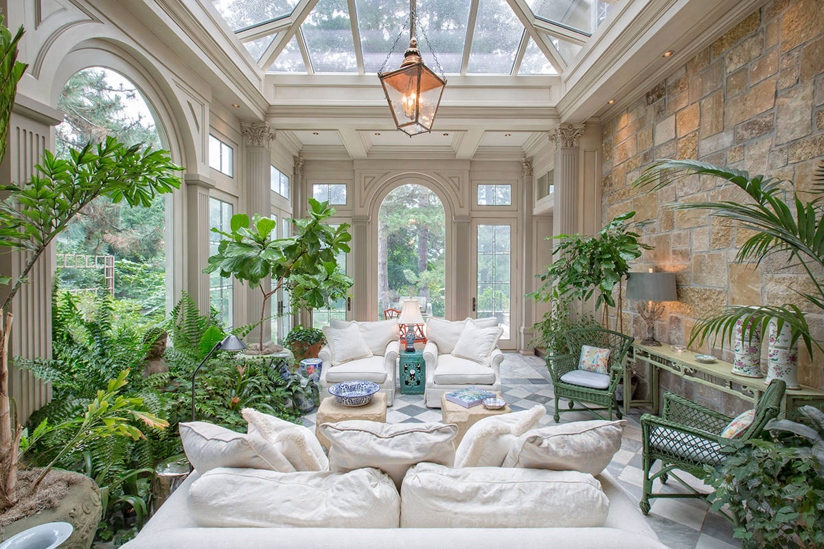 This timeless sunroom of a luxury home in Omaha, Nebraska also serves as a traditional family room. The classic living room design features a glass roof, large arched windows and a stone wall.
