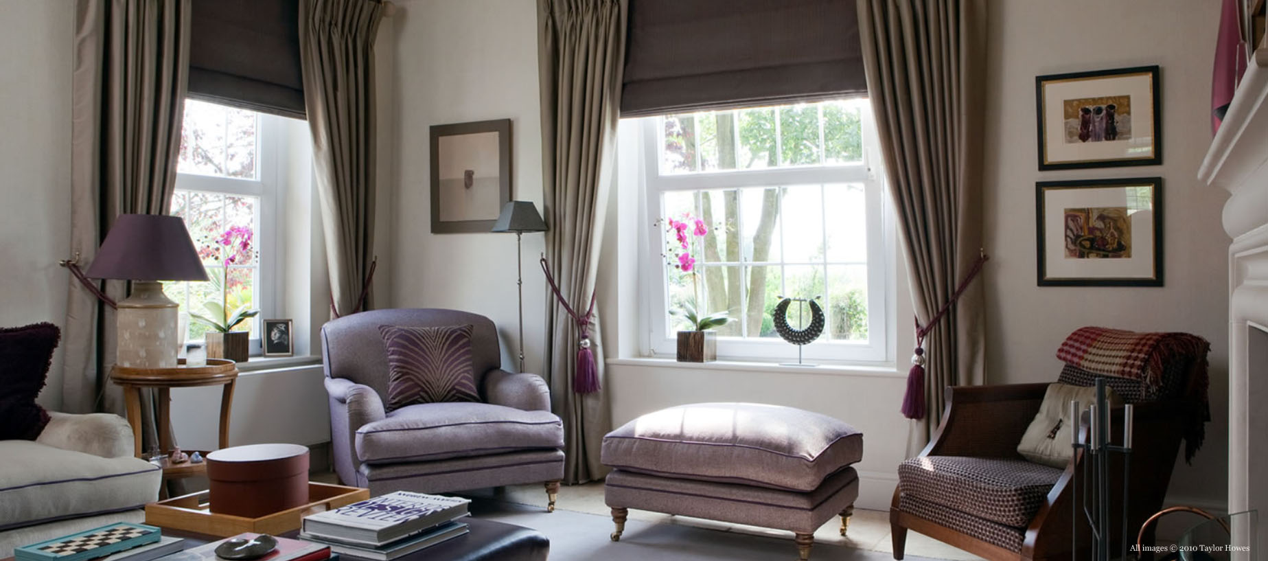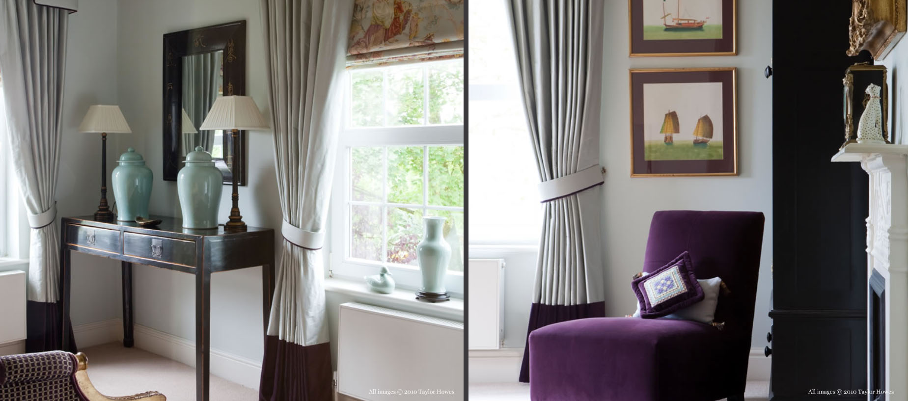 London interior design team Gail Taylor and Karen Howes of Taylor Howes used aubergine as a theme colour to create an atmosphere of casual elegance for this Wiltshire country house. The colour palette of aubergine – a trademark colour of Taylor Howes – goes with many other shades – greys, greens, pink, white, cream and chocolate.