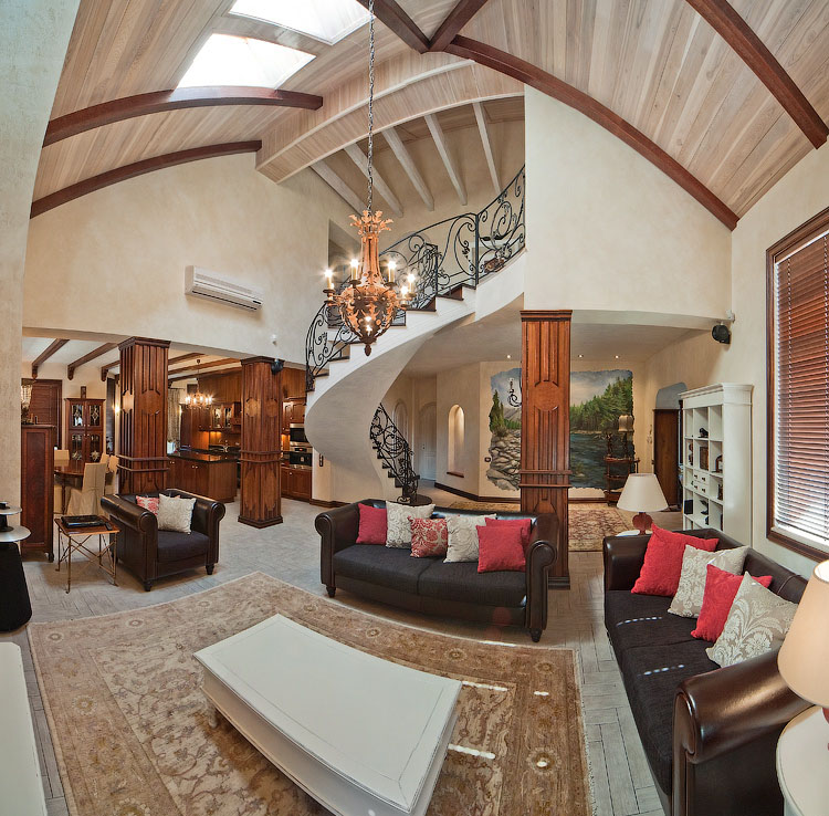 High vaulted wooden ceilings and a grand staircase with iron railings characterize this country house in Russia. The classic home design bring traditional elegance to the casual country atmosphere. Fine decorative details in the bathroom with black and white checkered floor tiles provide a whimsical flair to this interior space.