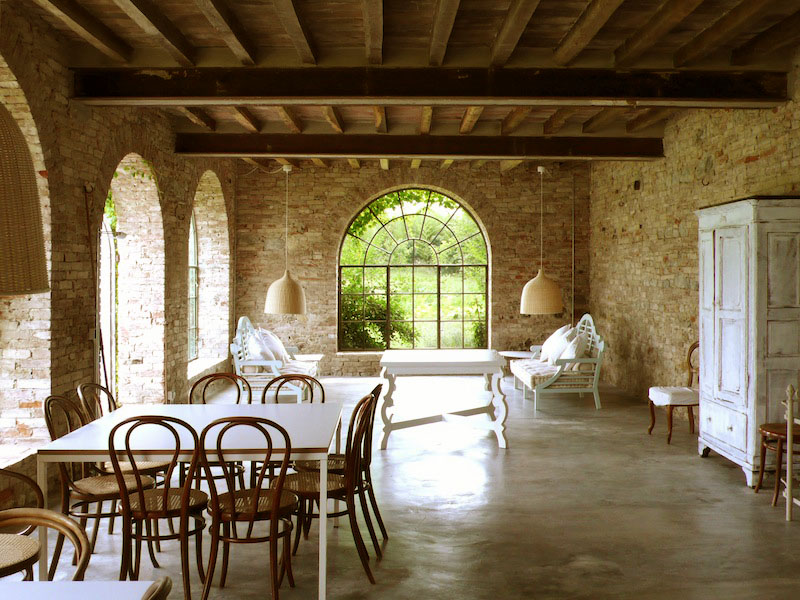 The soft contemporary interior decoration by Marina Sibaldi Benatti of a 14th century country house in Northern Italy has a charming ambiance that combines old with new. A green house with stone walls has been preserved and the main house elegantly restored. The beauty of the design lies in its simplicity. It’s Renaissance country charm with modern comfort.