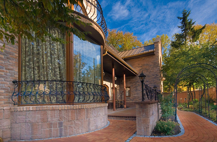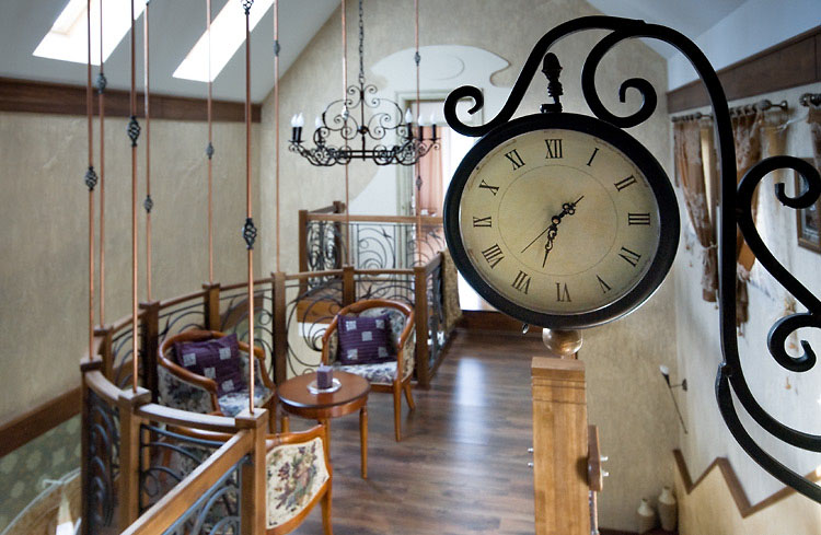 This interesting country house in Russia has a traditional country style with a touch of contemporary design. Wood is used throughout the house from the staircase and flooring to the furniture. The eclectic interior decor has an elegant yet homey feel.