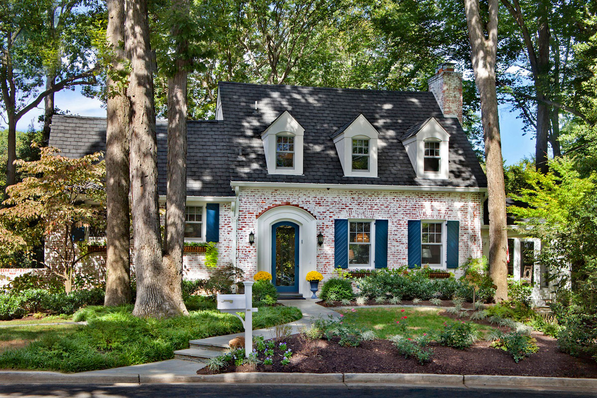 This quaint cottage style house in Bethesda, Maryland has been completely renovated. The exterior curb appeal is enhanced by the blue shutters which create subtle contrast against the white-washed brick.