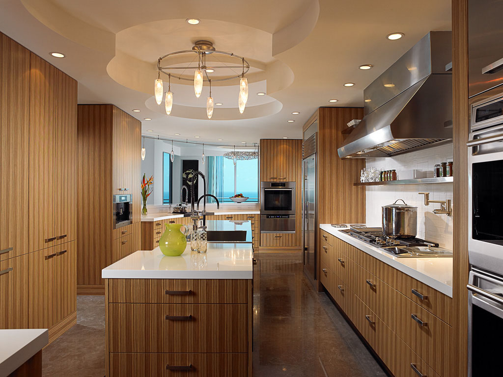 This Kosher Kitchen was designed to conform to Jewish religious custom. The contemporary kitchen has multiple work stations, appliances and cabinets for meat, dairy and parve. White tile and quartz countertops provide sterile conditions for cooking. Stainless steel appliances complement the zebrawood cabinet panels.