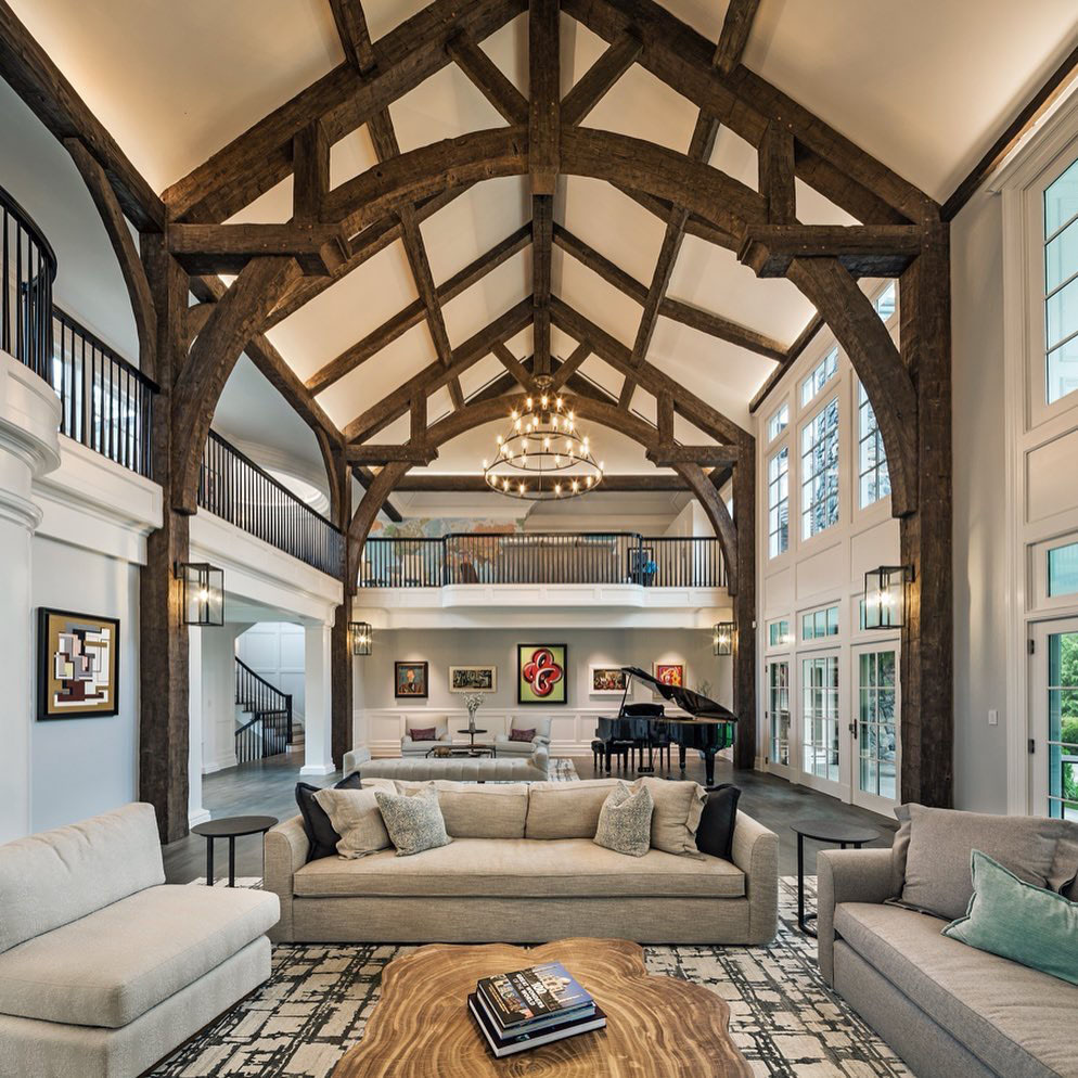 The Great Hall of this grand luxury estate in Greenwich, Connecticut is characterized by the soaring 28’ ceiling with reclaimed Douglas Fir timbers.