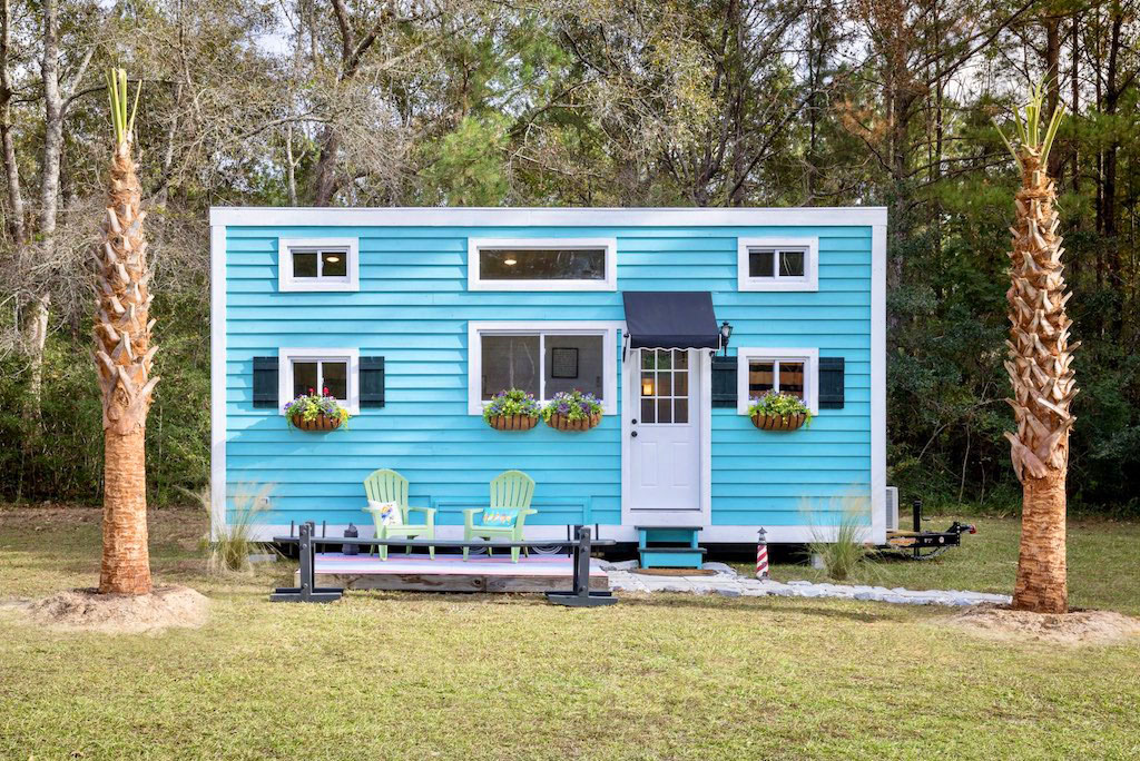 This tiny house in Charleston, South Carolina has a classic southern inspired exterior cedar plank siding painted in soft blue with white trim, and features window flower boxes.