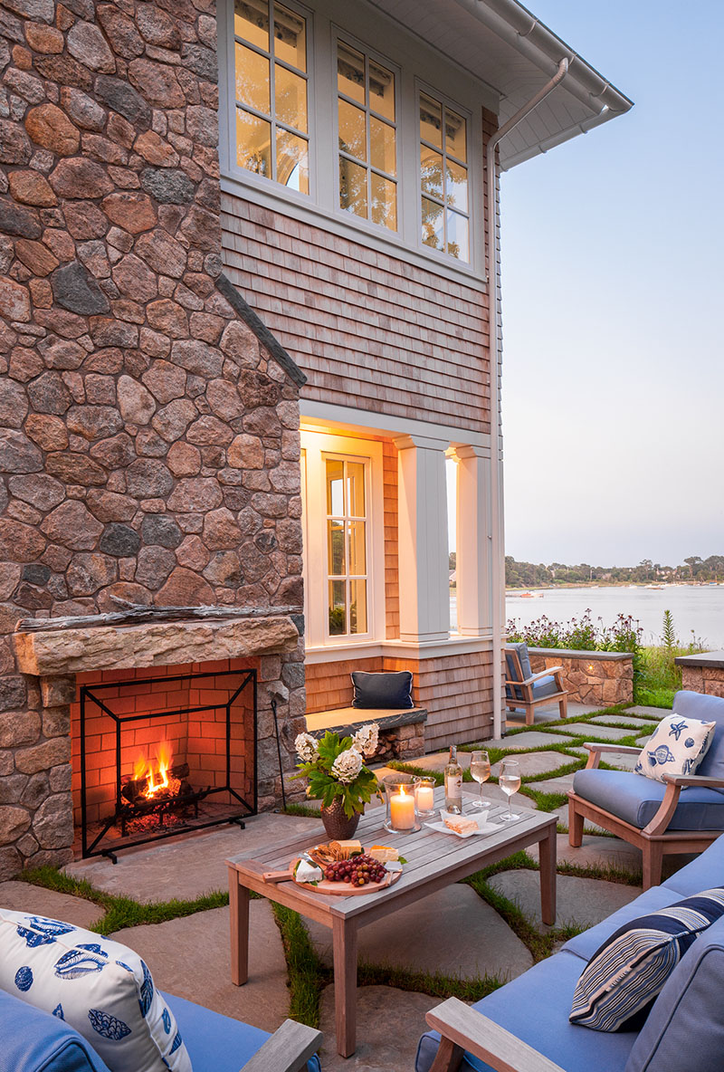 The house plan maximizes outdoor living spaces, including a covered veranda overlooking the water, sun and fireplace terraces, and a cozy balcony on the side of the house offering an intimate spot for relaxation.