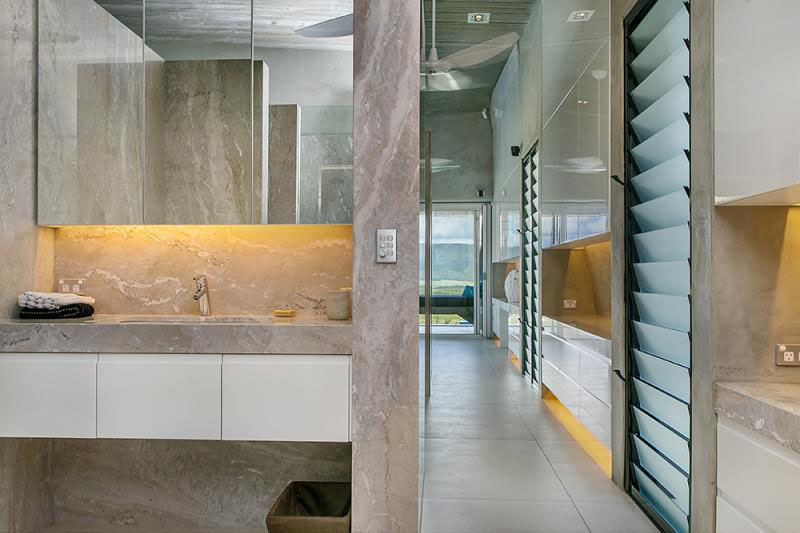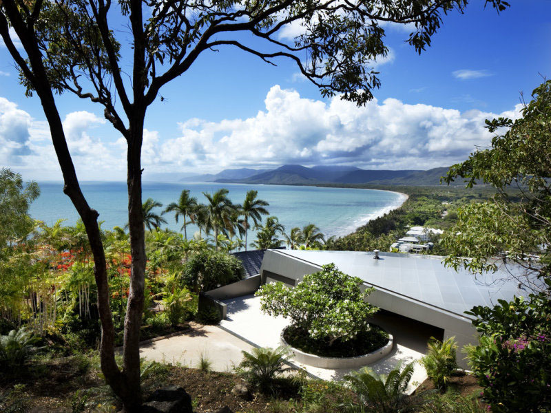 The Edge located at 20 Island Point Road in Port Douglas, Queensland, Australia floats off the side of a hill with spectacular panoramic view over the Coral Sea and tropical rainforest mountains.
