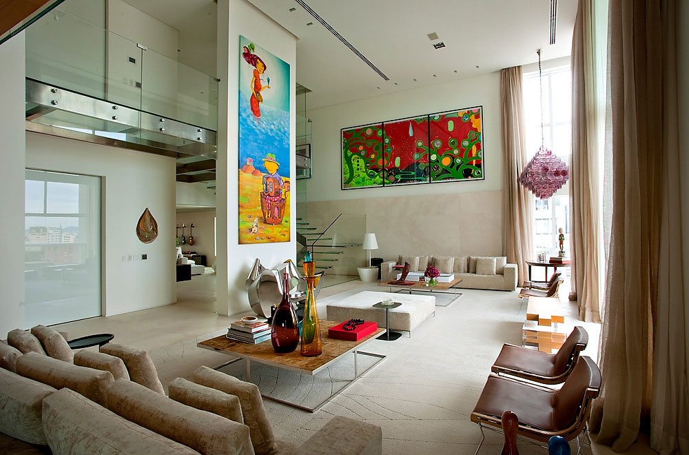The emphasis of this stunning duplex apartment in Malibu, California is on transparency and to provide complete integration between the different living spaces. The modern interior design makes full use of technology. Glass is a main theme throughout the apartment. There is a glass staircase and glass elevator. The clear glass swimming pool can be seen from the spa-like master bedroom above.