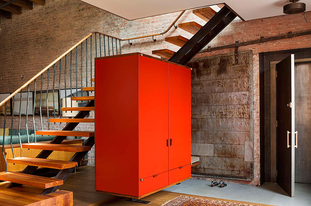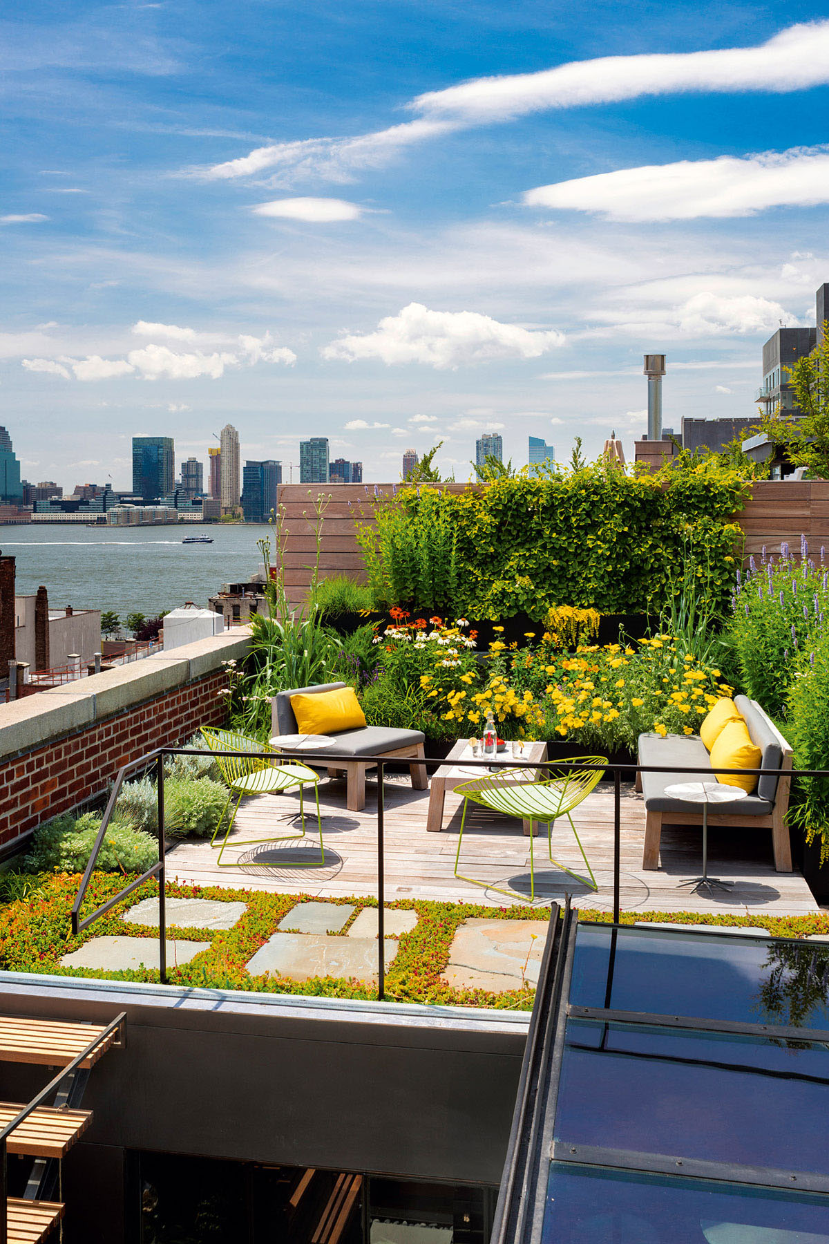 Architect Andrew Franz modernized a former warehouse in Manhattan, New York built in 1884 and turned it into a chic top floor loft apartment with mid-century style interior decor. A mezzanine interior courtyard with a retractable glass roof connects to the roof garden with views of the Hudson River and lower Manhattan.