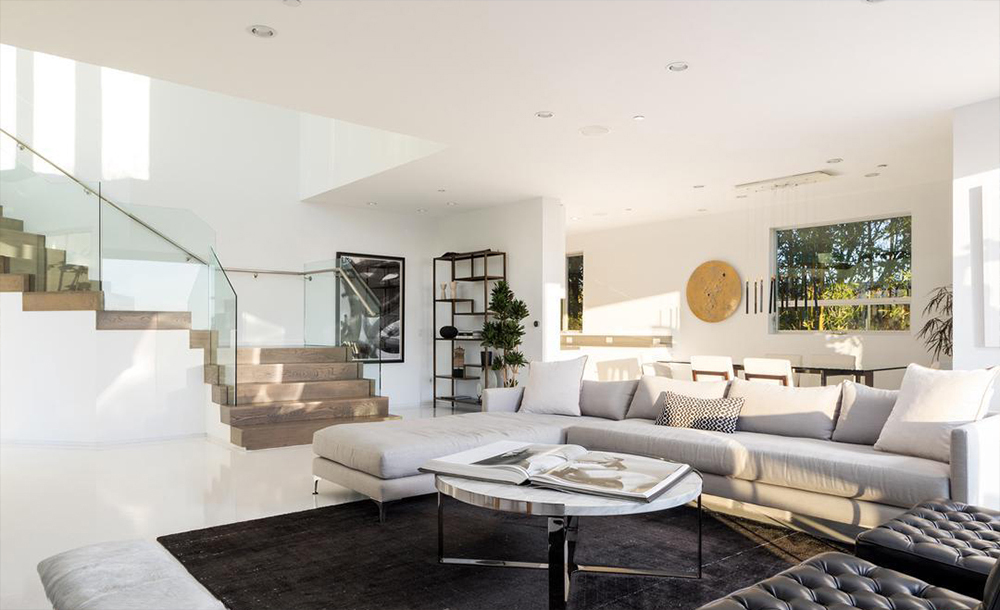 Perched above the Sunset Strip, the 4-bedroom villa features a penthouse-level master suite with spectacular views of the city. A spacious living area opens to a modern glass-railed terrace with panoramic views. Below the terrace is a ground-level swimming pool and spa surrounded by a wall of bamboo trees.