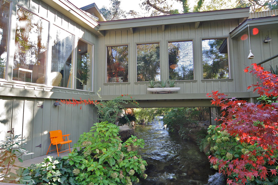 The house, which bridges a water flume, was designed by Frank Robert, a student of Frank Lloyd Wright’s. It is built on the spot where a fresh mountain flume meets the Kaweah River. A river literally runs through the house between the bedroom and the main living areas.