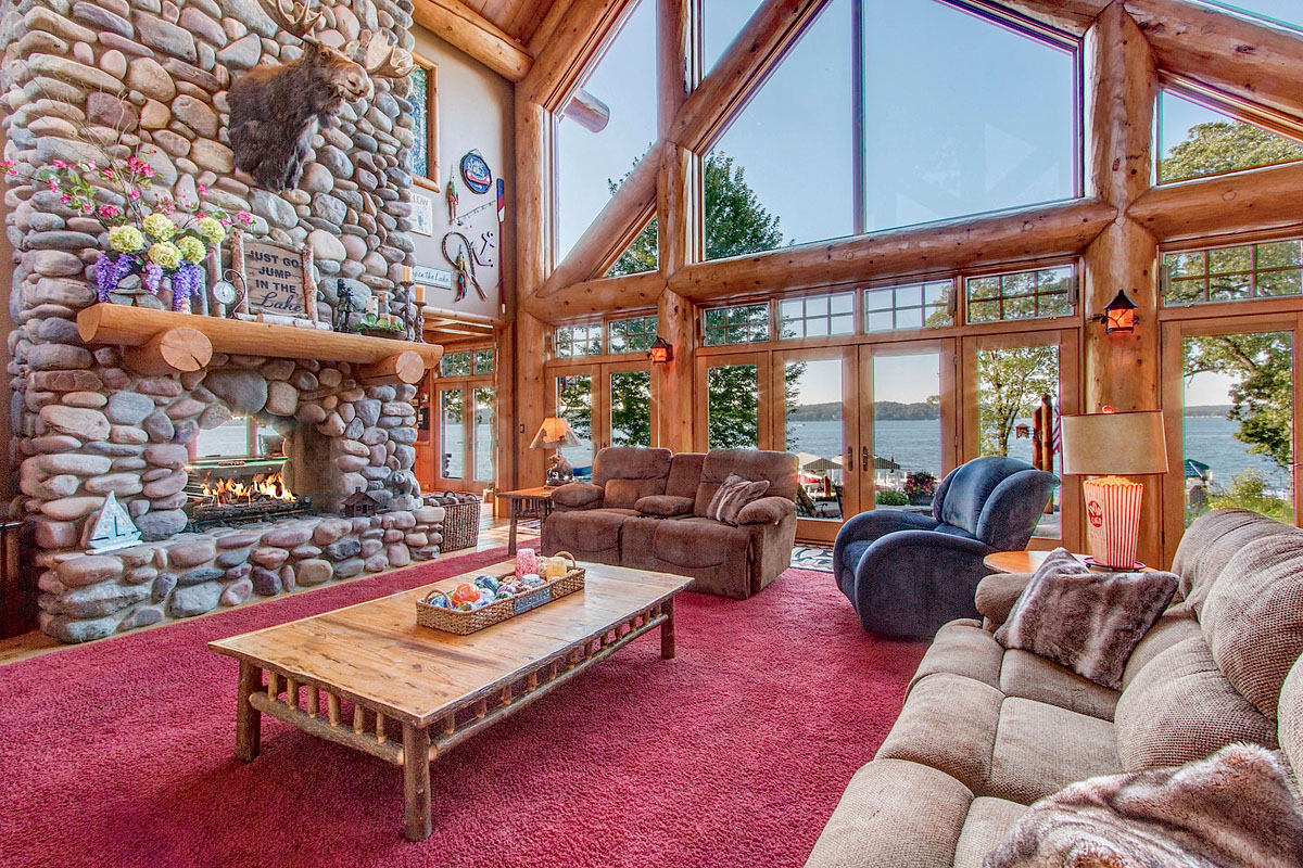 The house was designed by McCormack + Etten Architects. The massive great room is anchored by a stone fireplace and accented with Spruce logs. The floor-to-ceiling windows capture stunning views of the serene landscape and Geneva Lake.