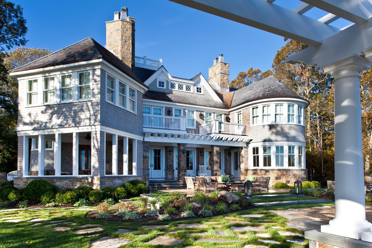 This beautifully updated Sag Harbor residence in North Haven, Long Island, New York is a Shingle-style house featuring cedar shake siding on the exterior with traditional architectural details of coastal luxury homes.