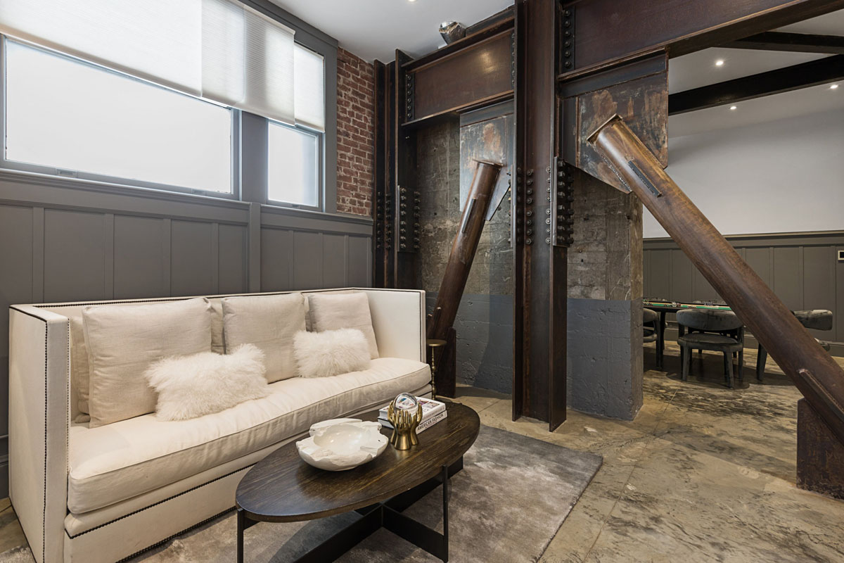 The main level showcases a spectacular great room with awe-inspiring 30-foot cathedral ceilings, exposed brick walls that add a touch of urban chic, and dramatic steel beams.