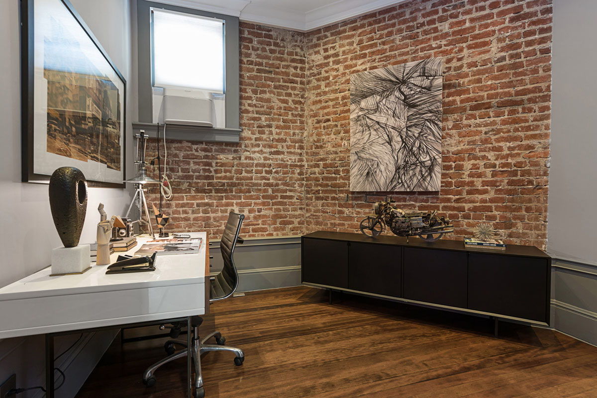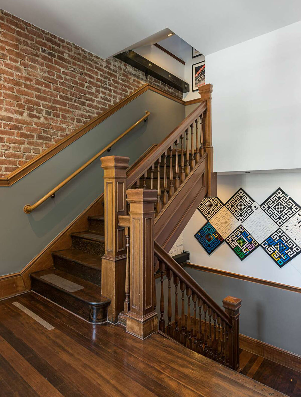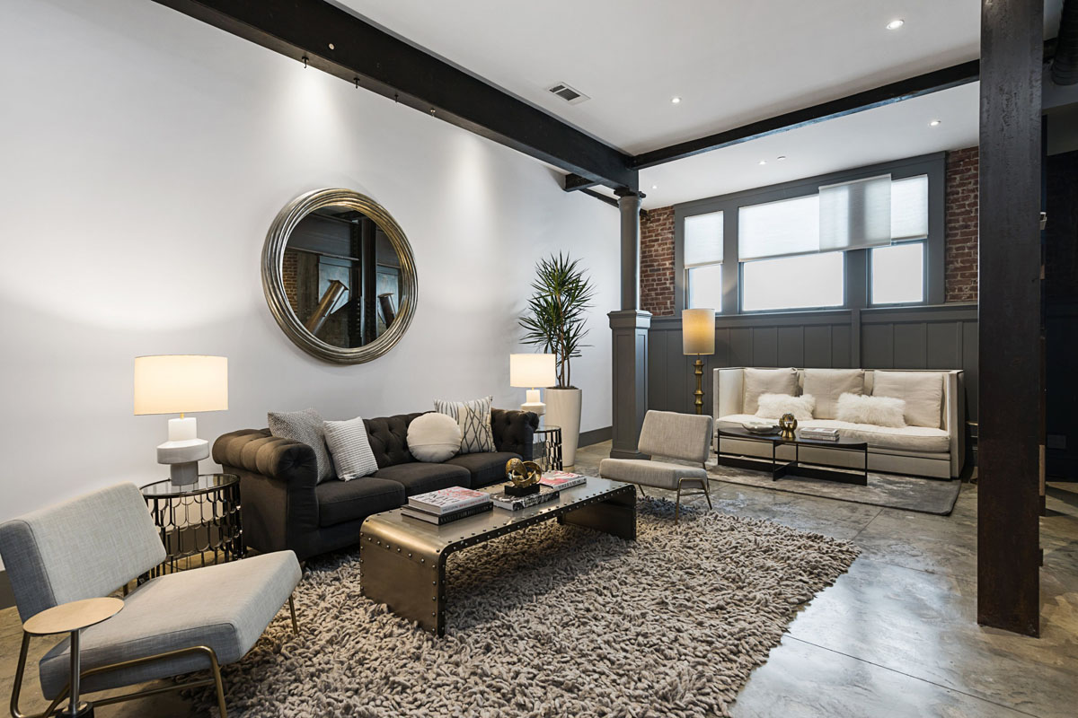 Arched alcove windows boasting original art-glass finishes cast a warm glow throughout the space, seamlessly blending historic charm with a modern industrial vibe.