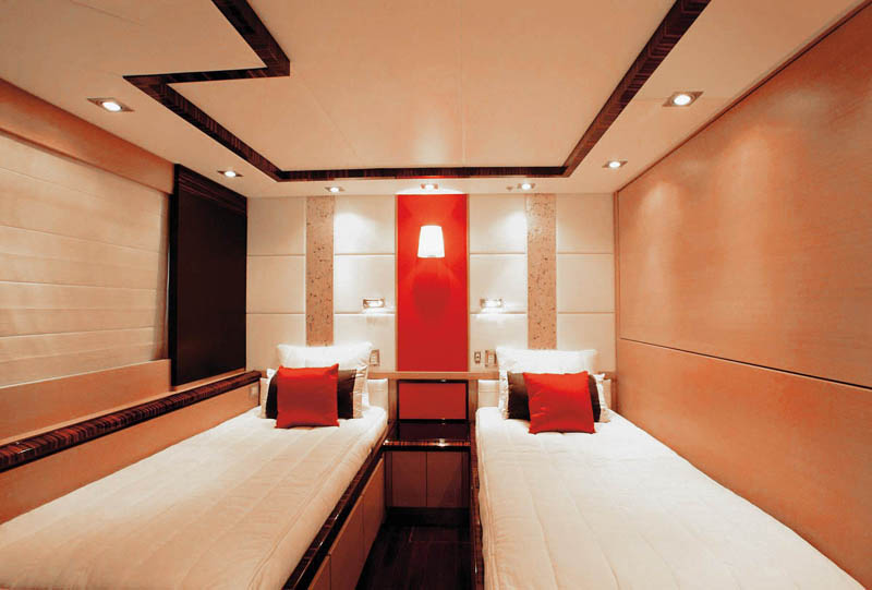 The interior design of Palmer Johnson’s luxury yacht “Dragon” by Nuvolari-Lenard is a work of modern fine art. Both the interior and exterior designs of this flamboyant superyacht are visually spectacular. The red, white and black theme in rectangular patterns — in the salon, the dinning room and the bedrooms — is an artistic tribute to this 21st century red dragon on the sea.