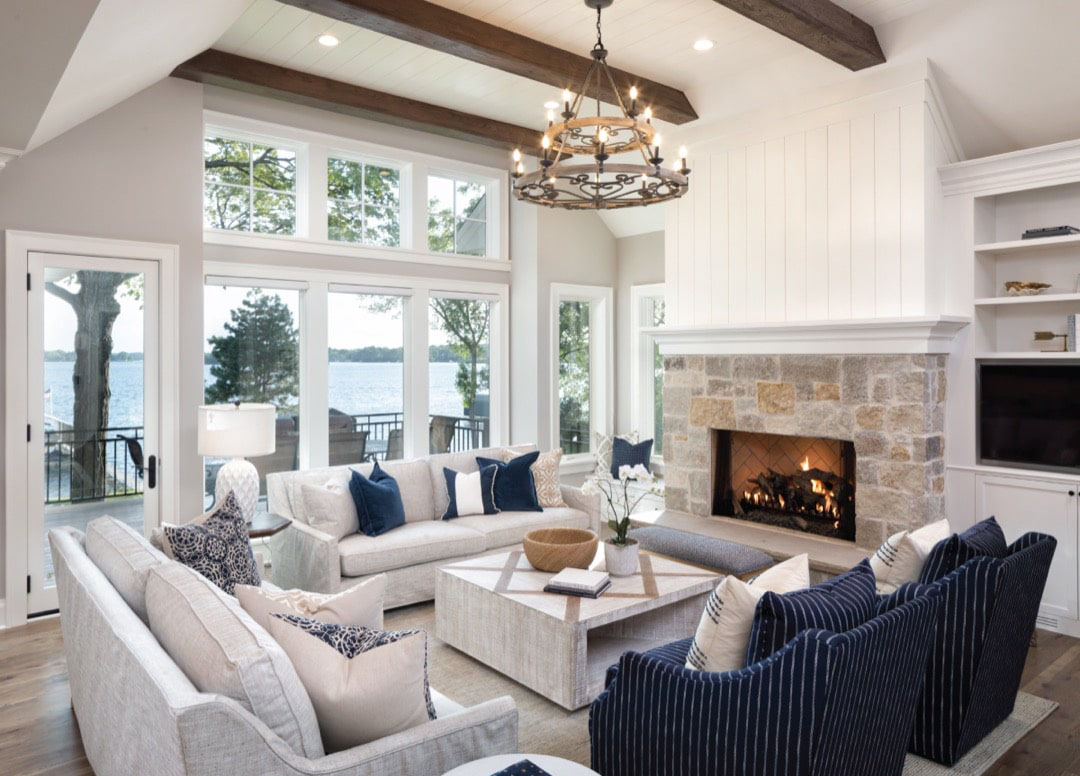 Built by Gordon James Construction, every inch of this lakefront house has been meticulously crafted. The interior design by Studio M Interiors provides a casual elegance to the lakeside property.