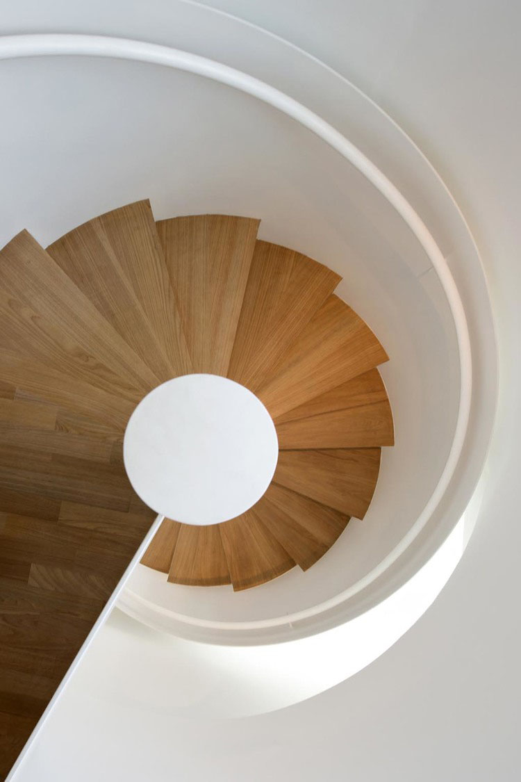 The 2,260 sq. ft. duplex has double-height ceilings and a mezzanine. A sculptural spiral staircase links the two floors.