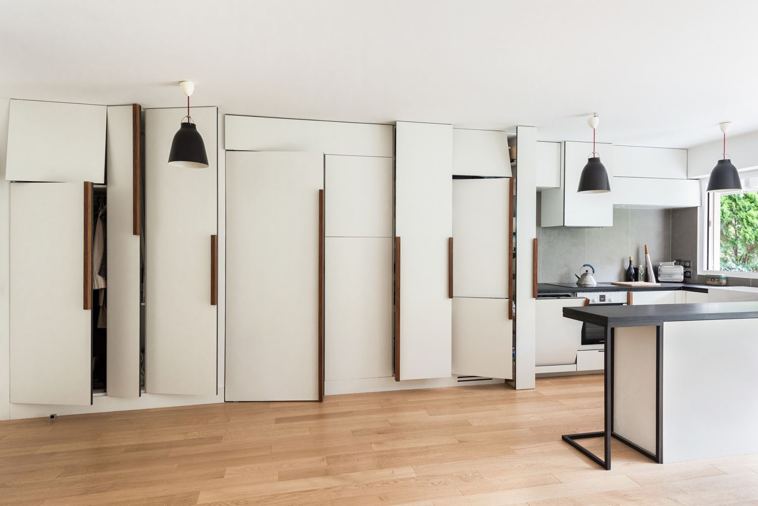 This intimate 570 sq ft apartment in Paris, France was refurbished with custom pivot doors which open to the bedroom and various closet spaces.