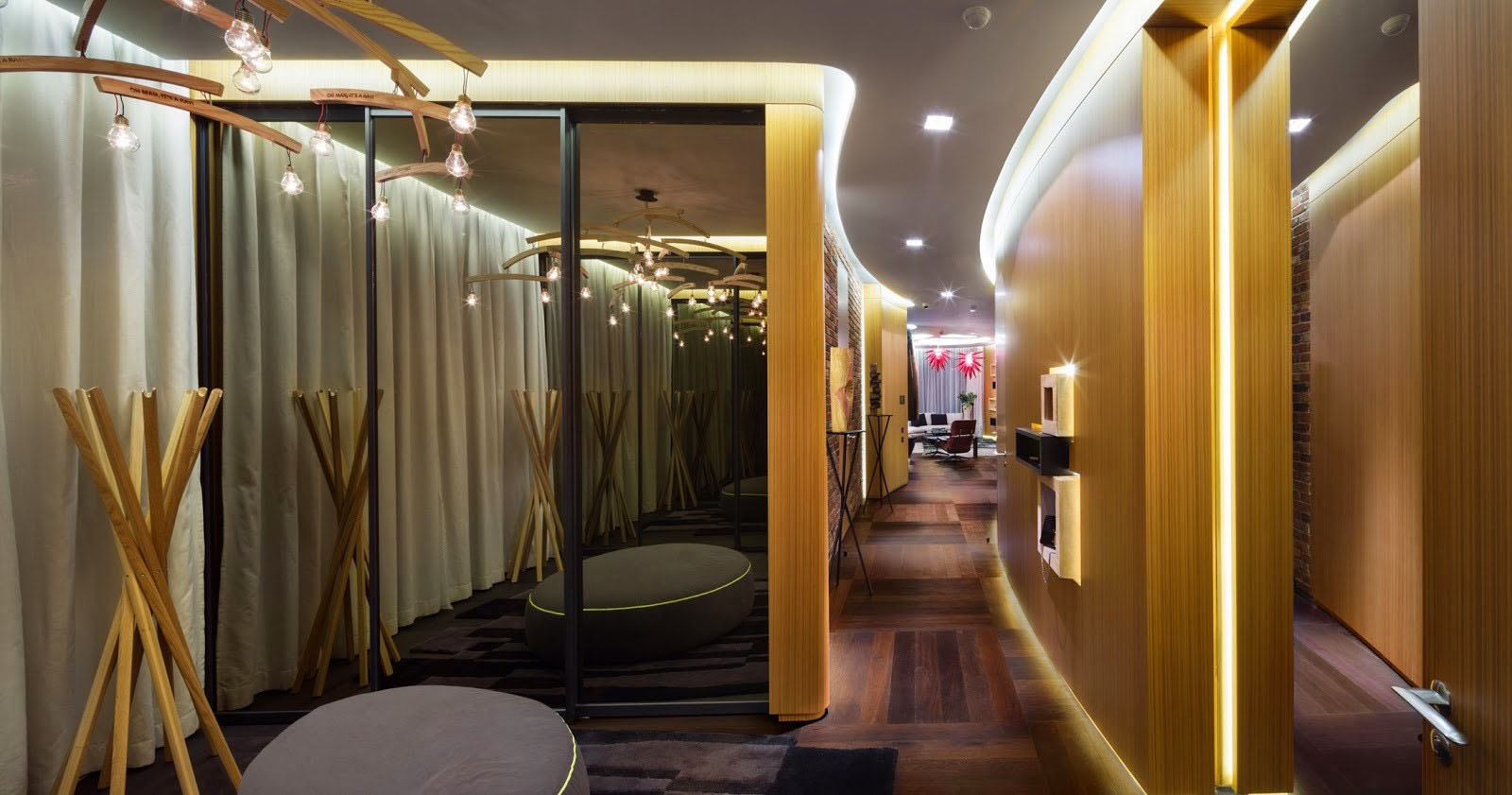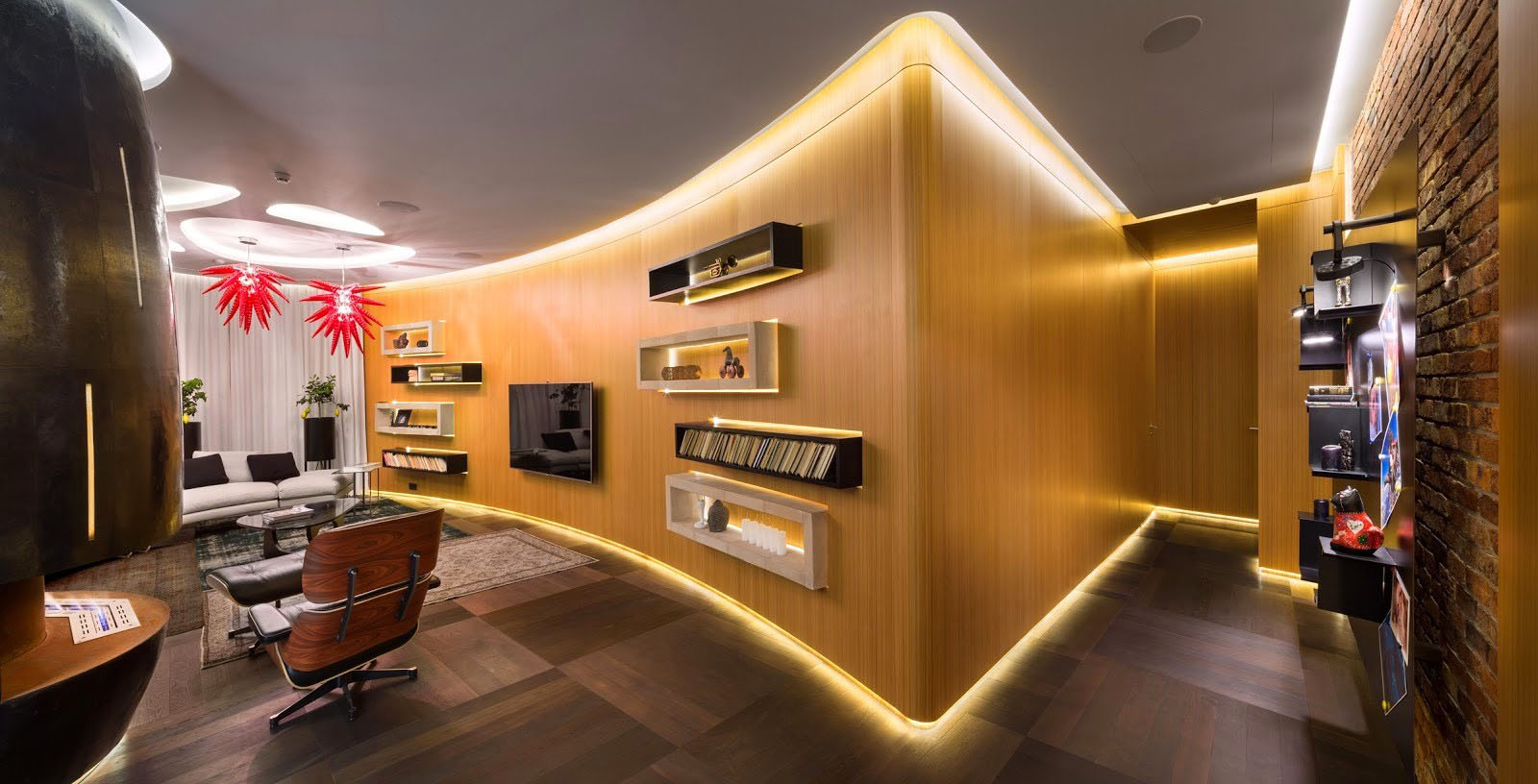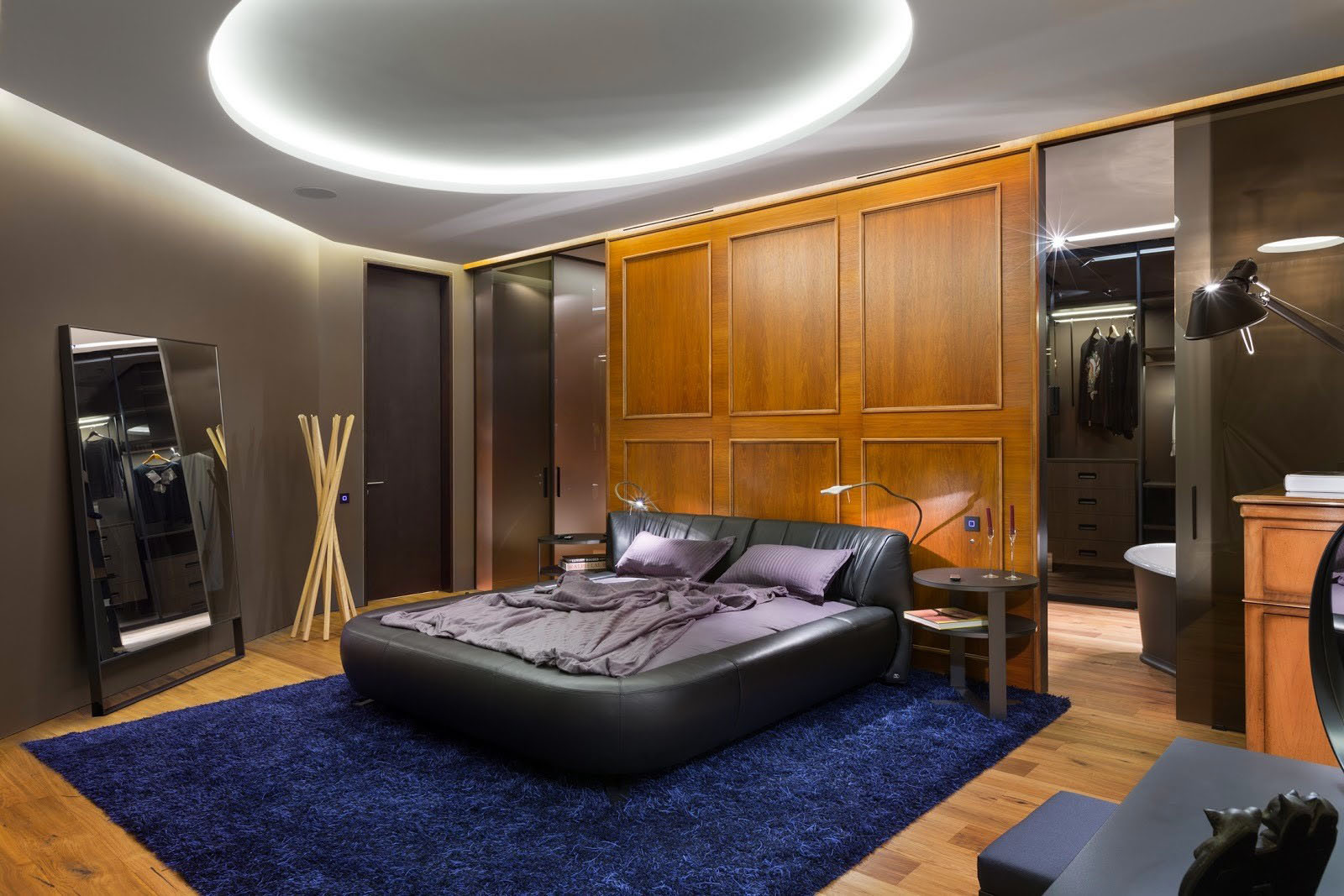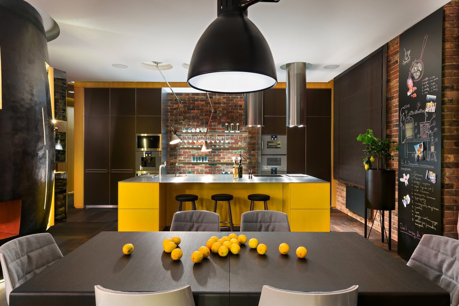 This stylish modern apartment in Kyiv, Ukraine designed by Baraban enjoys panoramic views of the city. An interesting art piece in the form of a fireplace which also doubles as a wine storage cabinet sits at the centre of the apartment.