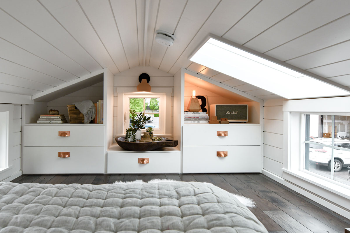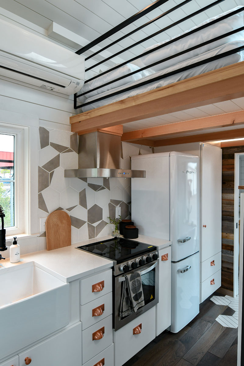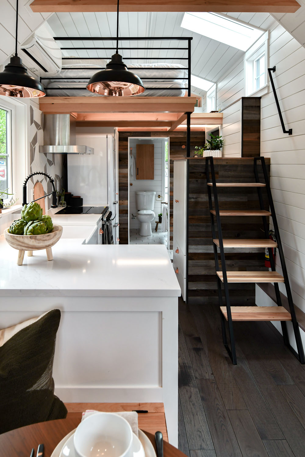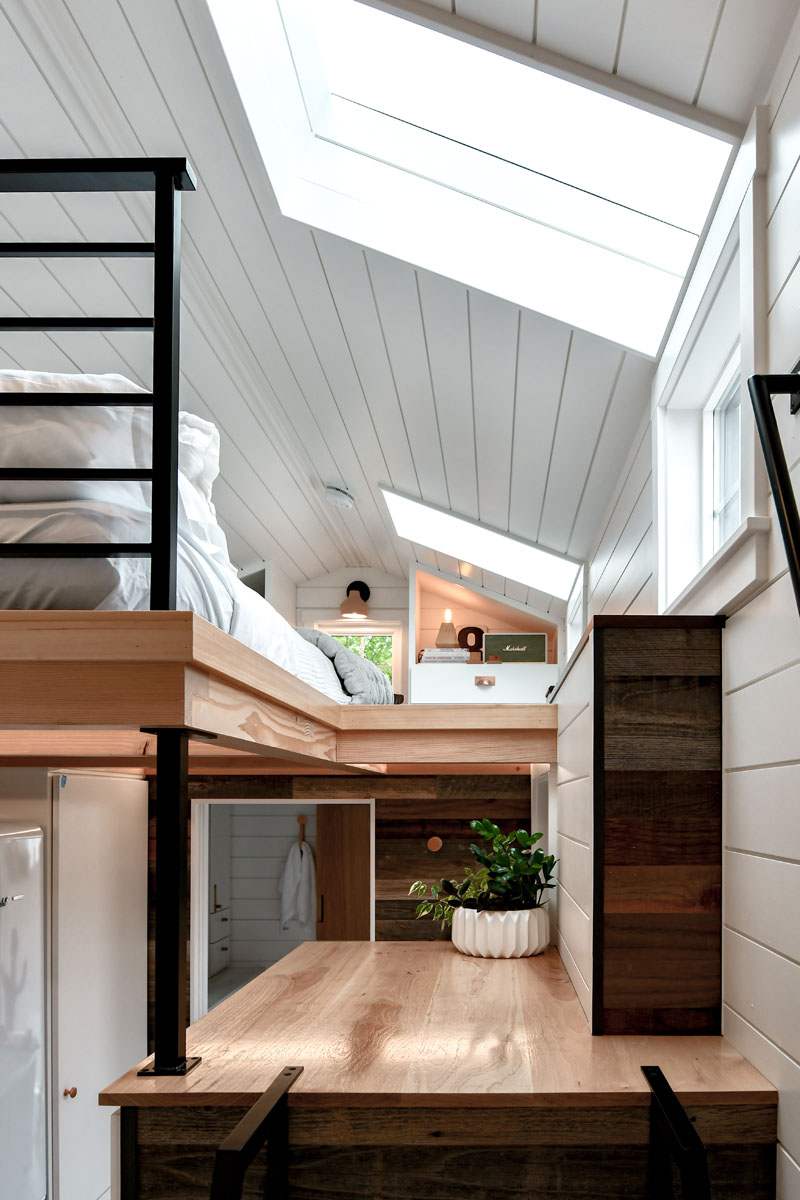 The custom built tiny home has two fixed skylights over the main loft, and a lofted master bedroom is accessed by a custom wood and steel open shelving staircase.