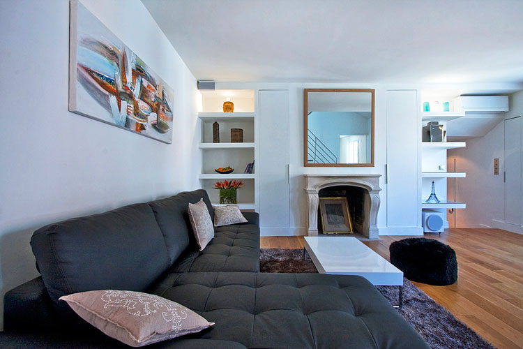 Located in the heart of the Left Bank in Paris, France, this stylish modern duplex apartment has a terrace with view of the Eiffel Tower. The 66 square meter (710 sq. ft.) apartment is housed in an 18th century building on a quiet cobble stone street. The living area has an original stone fireplace and oak hardwood floors and a modern open kitchen. The bamboo-and-plant terrace features a seating area for meals and relaxation.