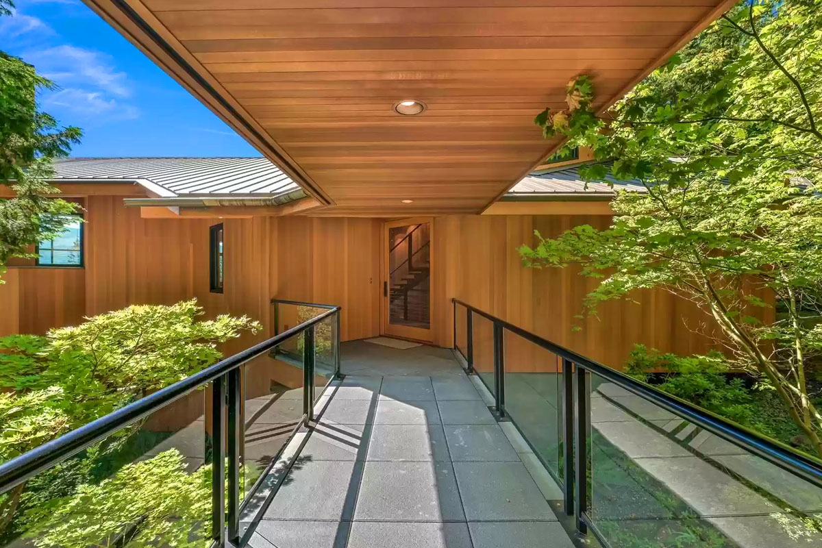 A bridge spans from the higher auto-court elevation to the house main entrance and the expansive views of the lake.