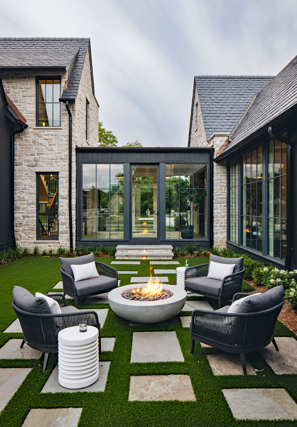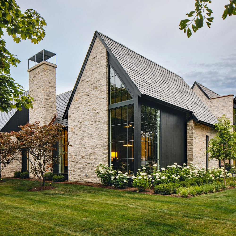 The striking interplay of stone and expansive glass surfaces creates a captivating aesthetic that bridges the timeless beauty of classic architecture with the clean, minimalist lines of modern style.