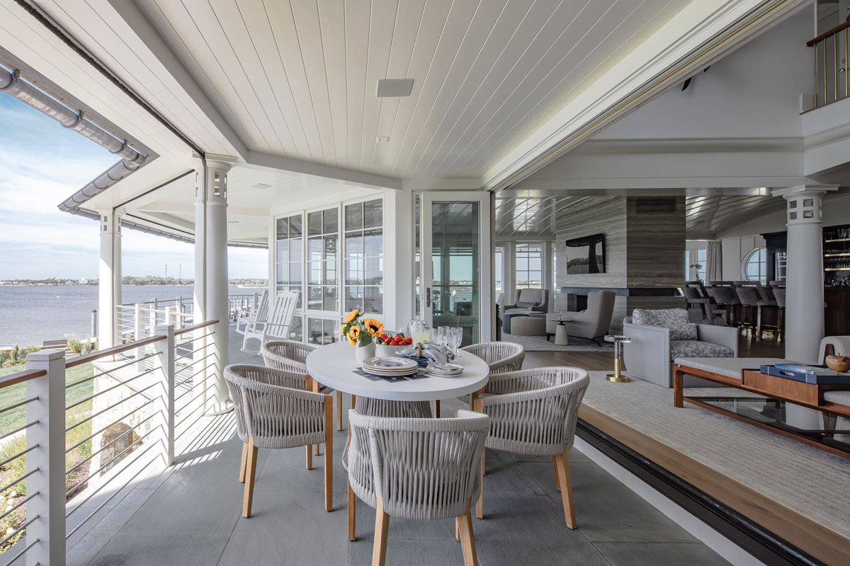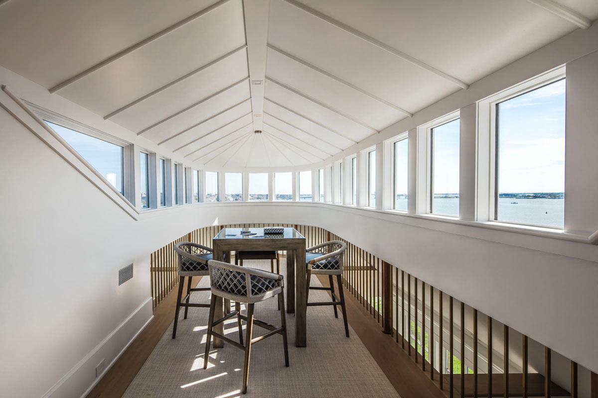 Christopher Pagliaro Architects and Linda Ruderman Interiors collaborated on the unique design of the coastal shingle-style bayside home with round staircase tower and nautical theme.