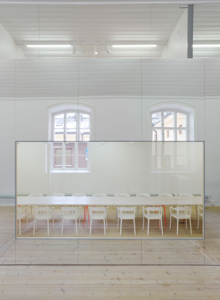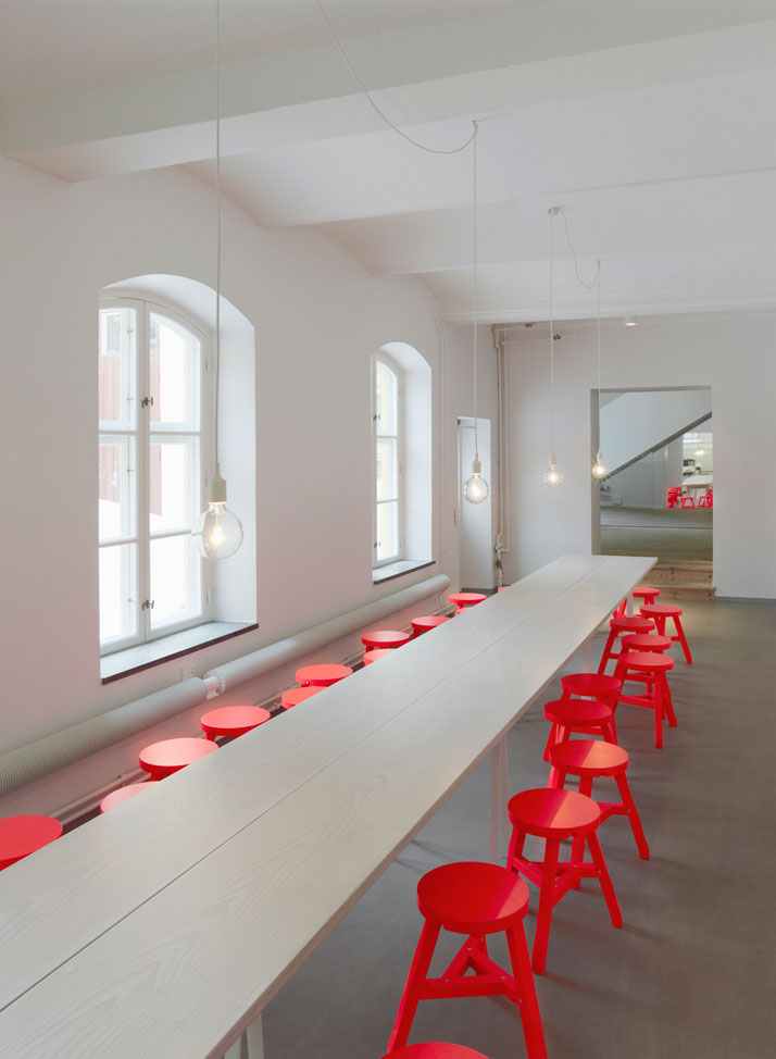 The modern interior design of consulting firm No Picnic in Stockholm, Sweden has a simple yet creative atmosphere. Swedish architect Elding Oscarson use reflective aluminum walls to make the space appear bigger.