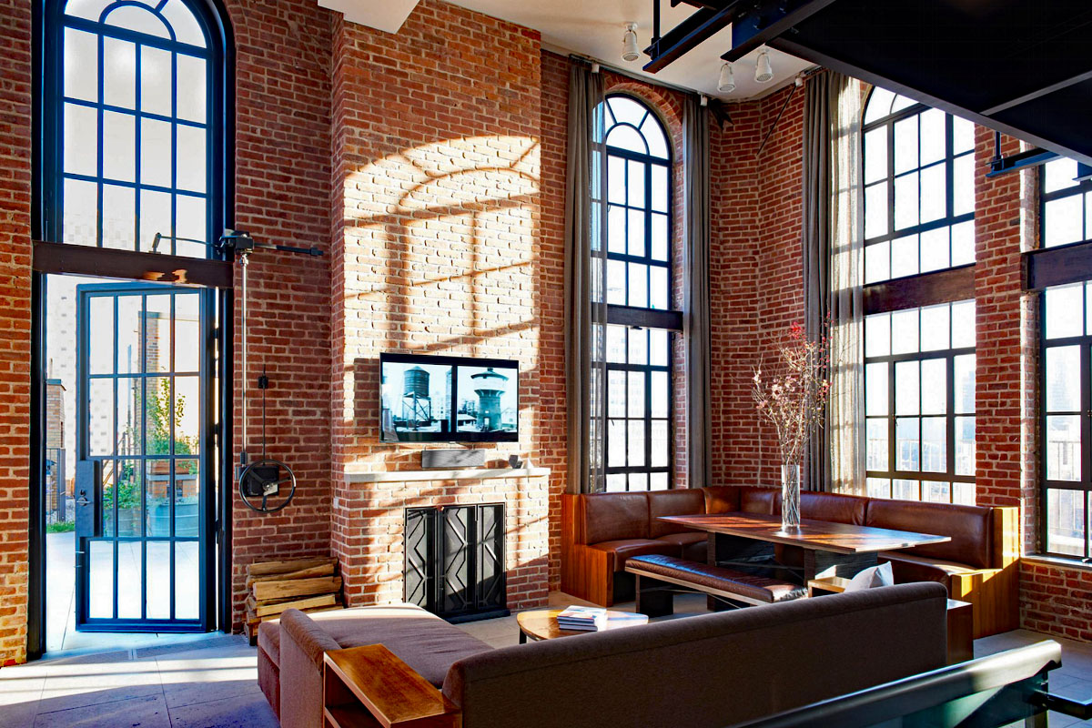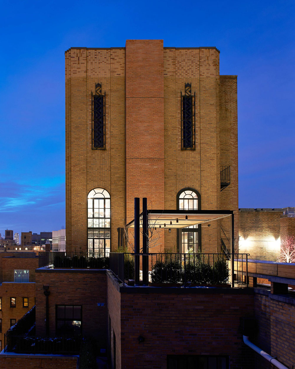 This modern penthouse apartment in New York City includes 3,500 square feet of interior space that spans two floors plus an interior mezzanine and 2,500 square feet of exterior roof terraces.