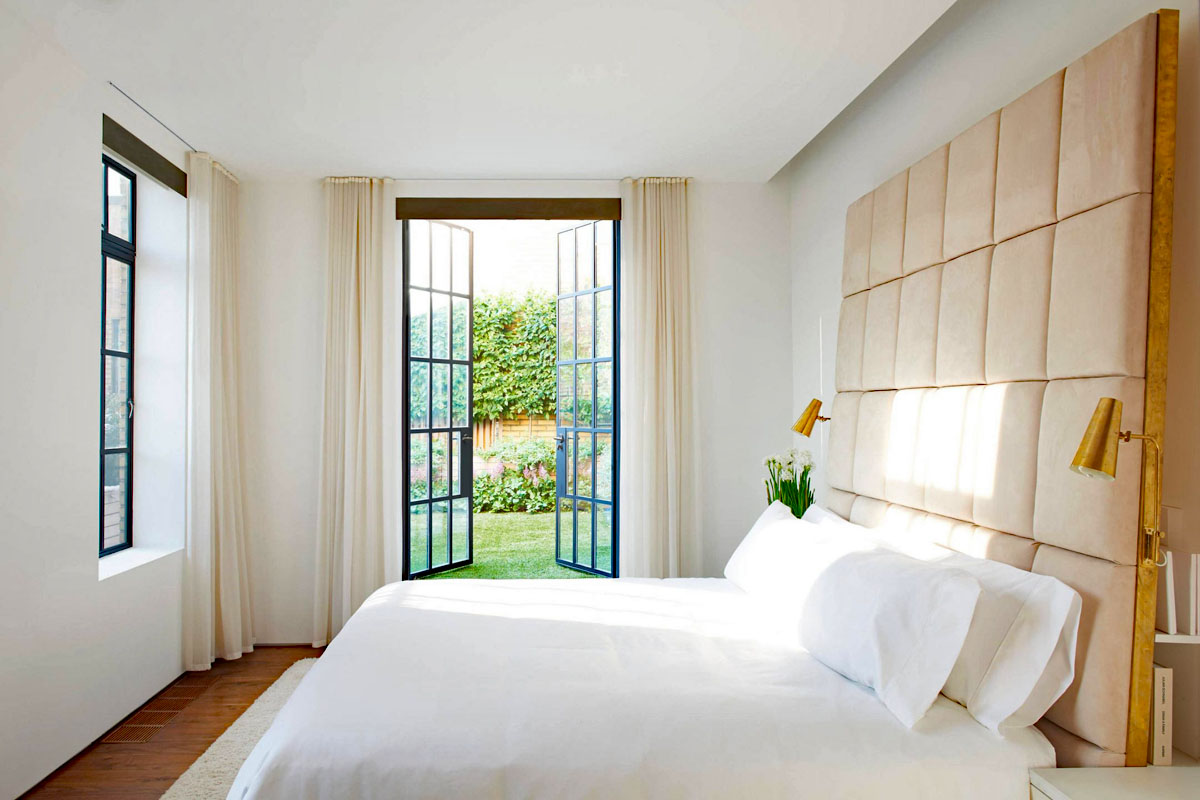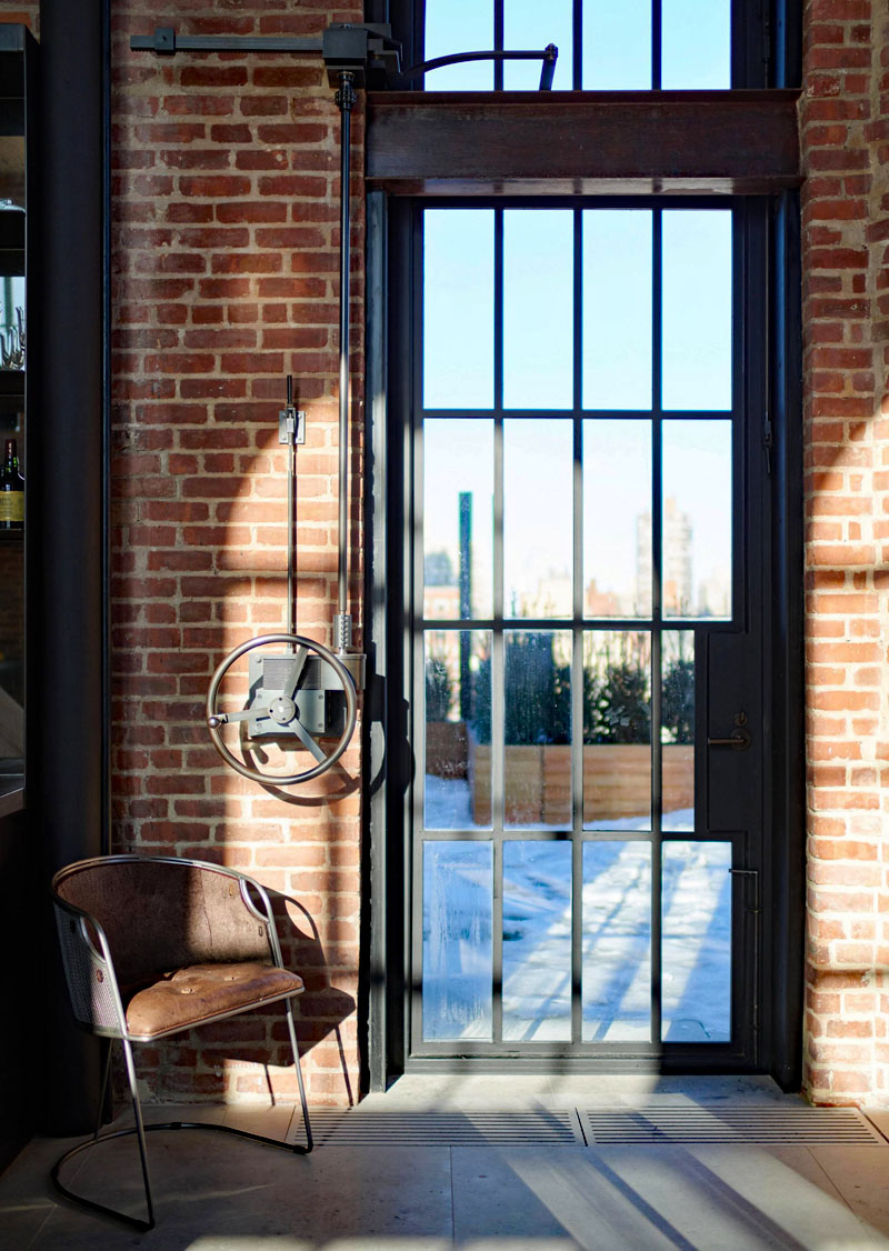 The main living space opens to the exterior garden using a 17-foot-tall steel framed window that operates like an oversized Dutch door controlled by a hand-crank mechanism.