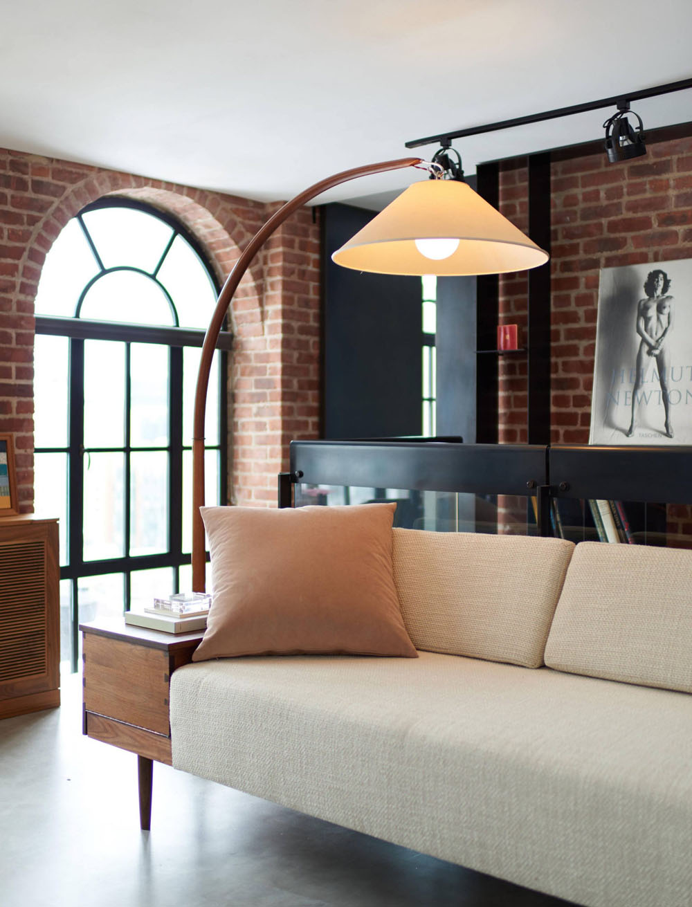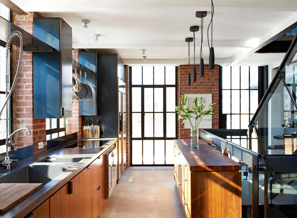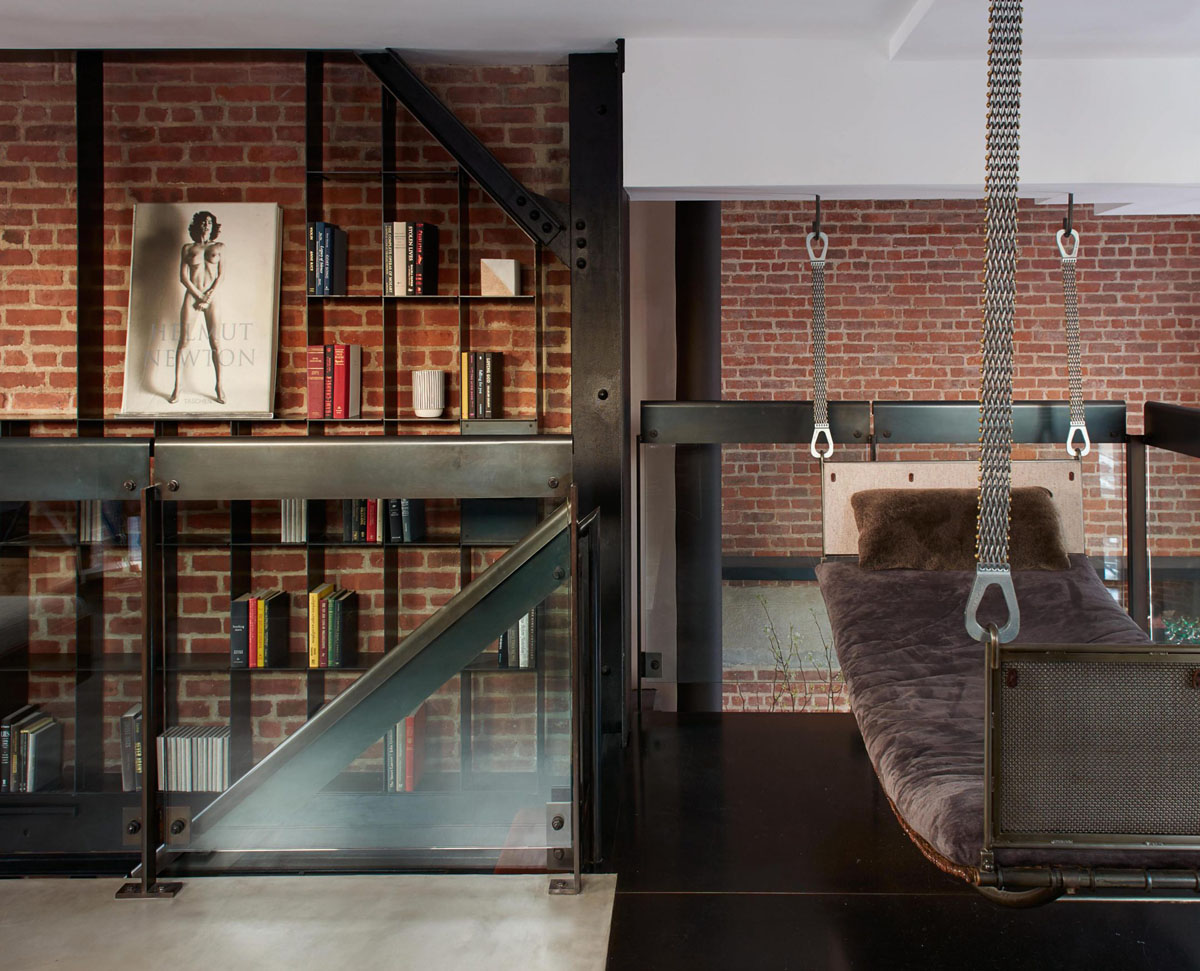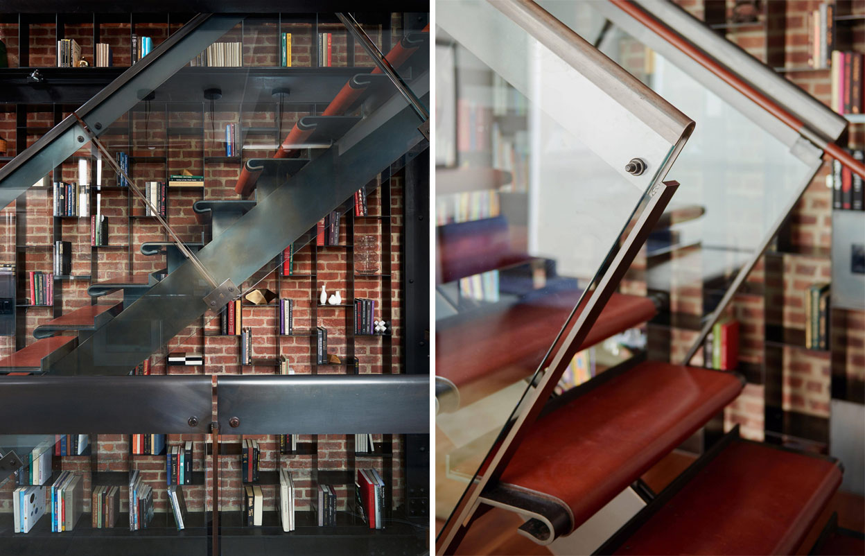 Central to the design is a steel stair, which connects all three levels of the penthouse, and also serves as a multi-story bookshelf.
