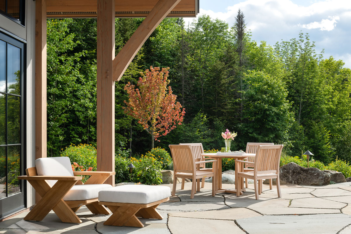 Inside, the great room and patio share stunning panoramas of the Green Mountains. The interior design by Flanagan Interiors embraces a rustic-chic ambiance. Natural wood, stone, earth tones, and carefully selected fabrics create a cozy yet refined atmosphere.