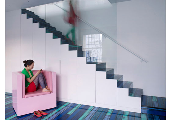 The Rainbow House, located just off Portobello Road, is an overflowing of creativity and modernity with its use of colours. The design is centred around the spiral staircase with rainbow colours. The continuation of the theme is highlighted in each room with individual colour scheme. The most extraordinary feature, is perhaps the trap door in the bedroom above, with access to a shiny slide that snakes its way down to the yellow sofa in the living room right next to the open kitchen.