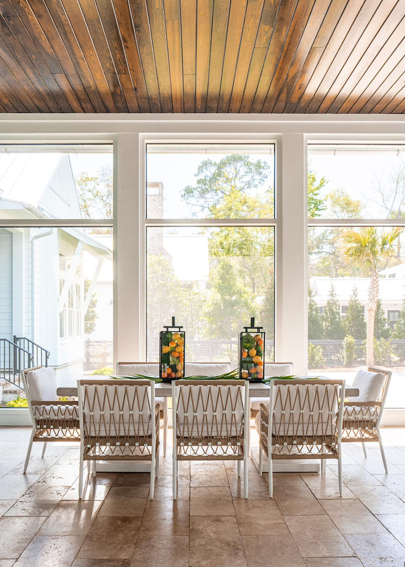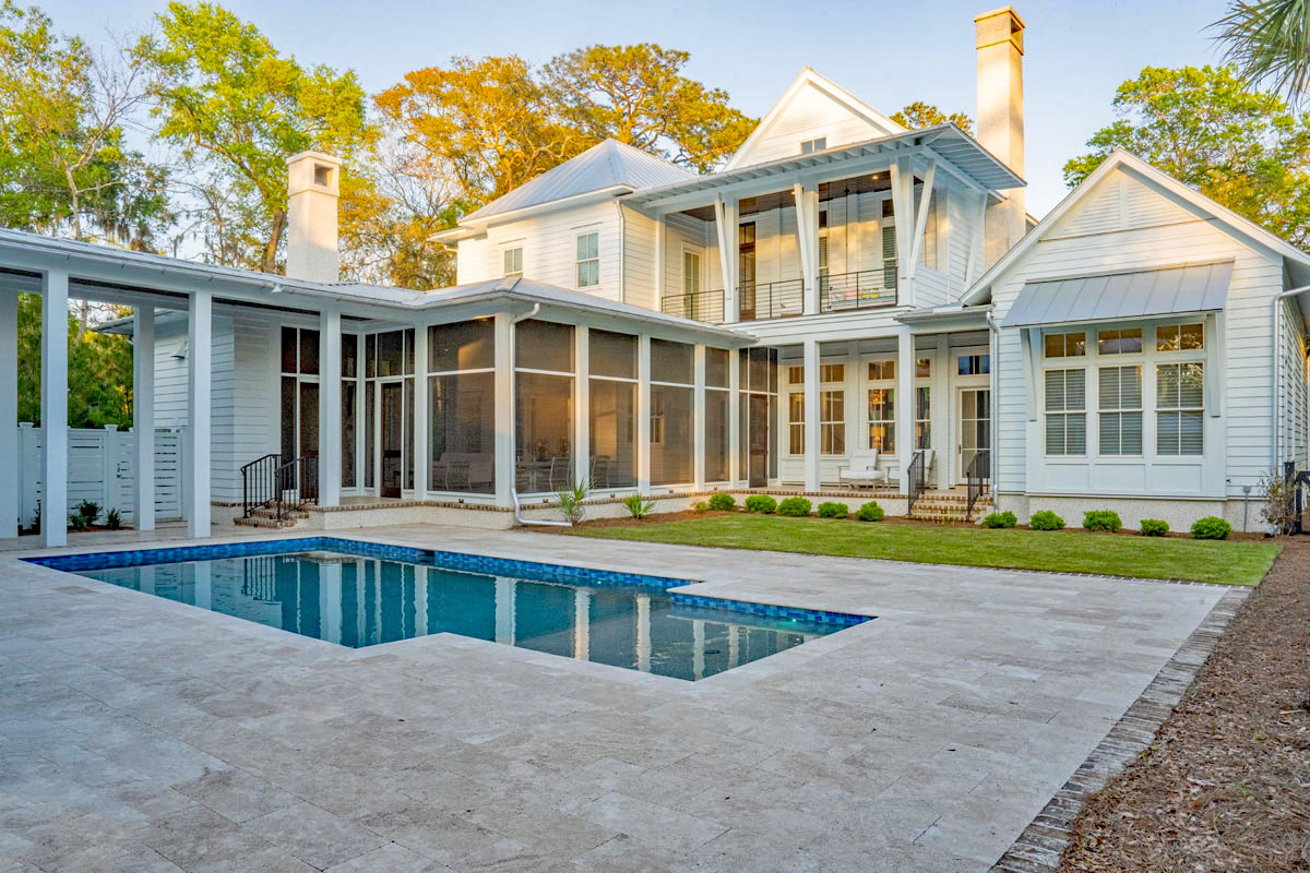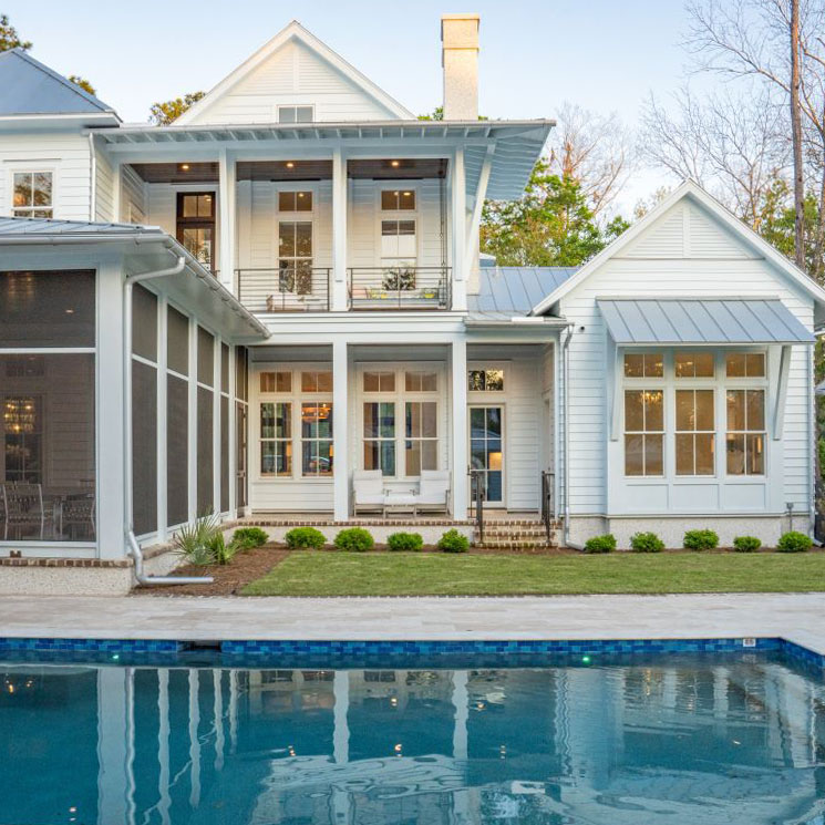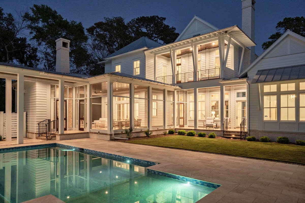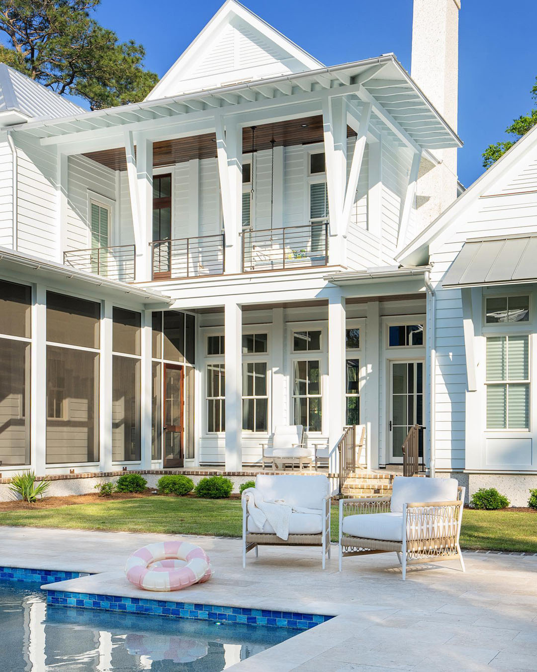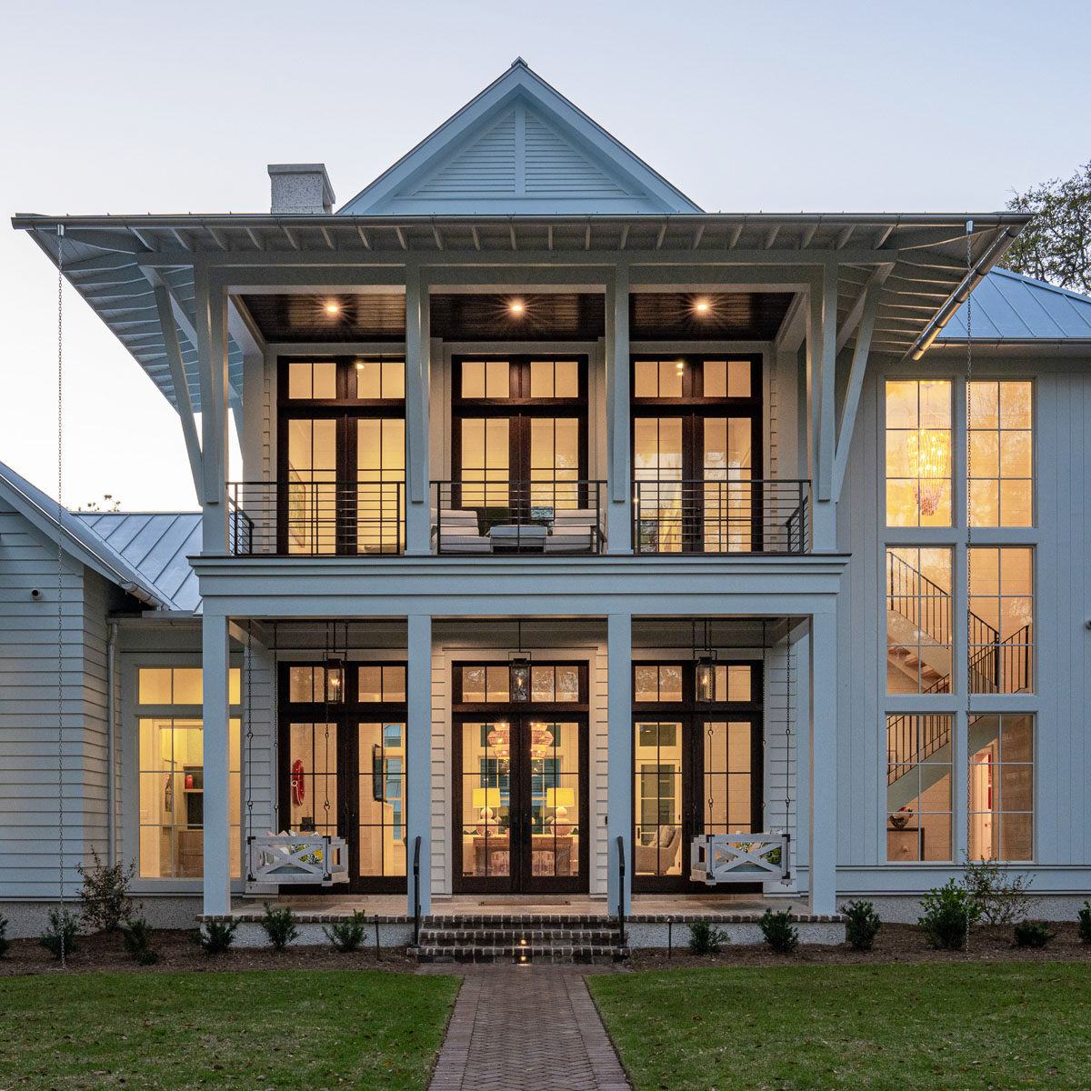 Designed by Court Atkins Group and built by H2 Builders, the home’s exterior is a captivating blend of classic Lowcountry architecture and modern design. Prominent rooflines, graceful columns, and a striking glass stair tower are just a few of the architectural elements that make this home truly unique.