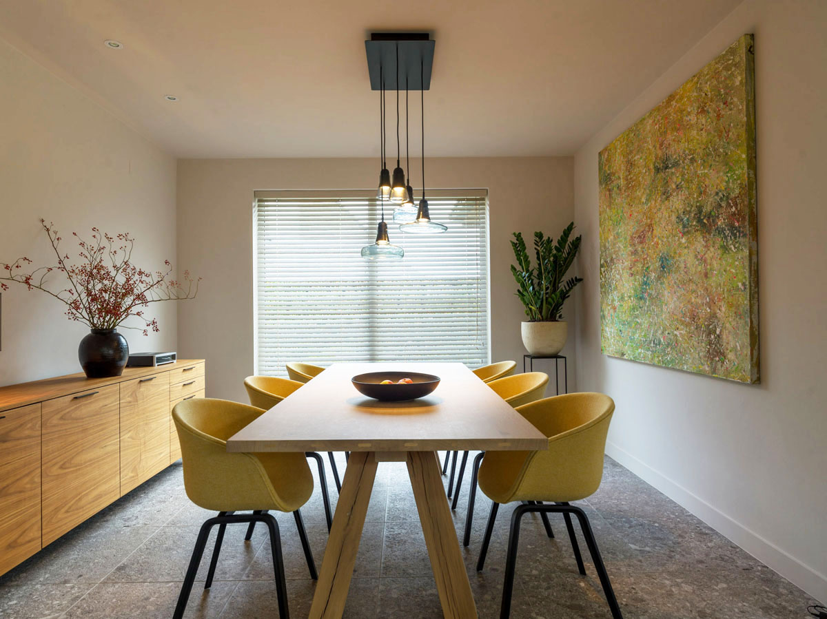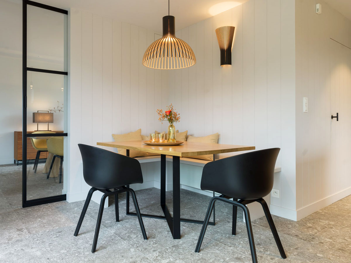 This contemporary home with country style influence in Belgium was designed by Emily et Nous using wood and neutral colors to create a rustic elegant theme throughout the house.