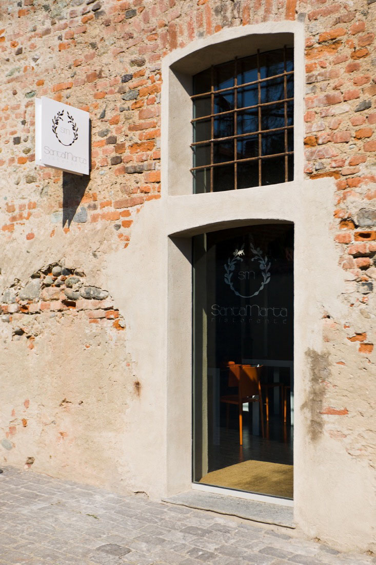 Santa Marta Restaurant In Mazzè, Italy is a contemporary restaurant in an old 18th century chapel. The interior design by Studio Kuadra conserves the framework of the three-storey ancient chapel. The first floor of the old chapel has been transformed into the main dining room. A gallery above overlooks the dining room through two small balconies. The minimalist interior decor provides a natural and attractive balance to the brick walls of the old structure.