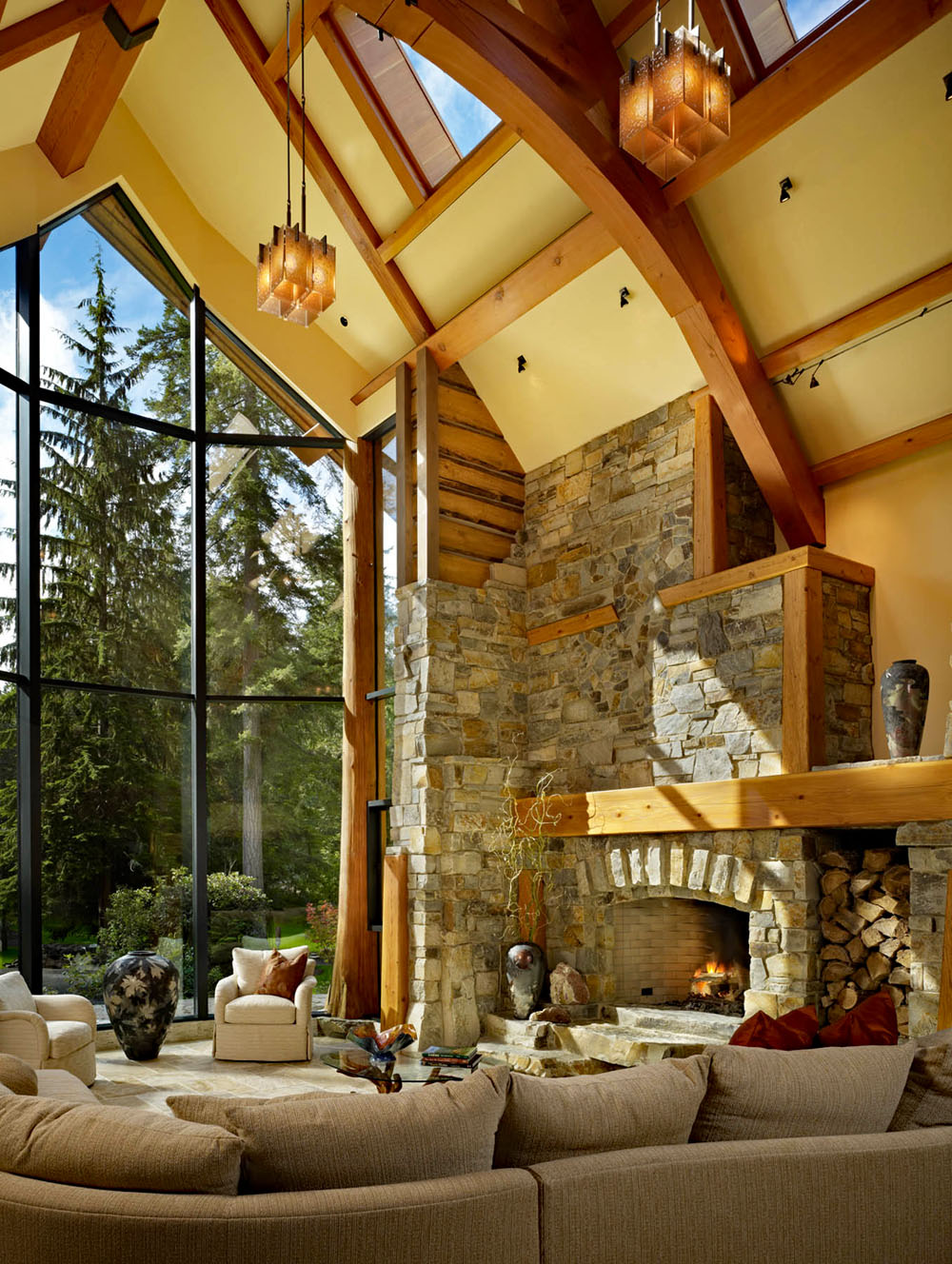 The dramatic double height main living room features a stone fireplace and wood trusses. Large floor-to-ceiling windows frame the breathtaking view of the cedar trees.
