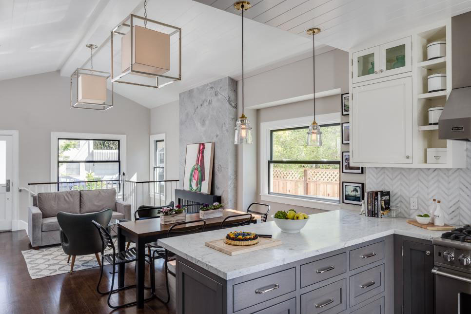 The small bungalow house is packed in stylish contemporary interior decor. Luxurious touches throughout the house like marble kitchen countertop, glossy white and neutral walls brightens the home. Space-saving features such as a sliding barn door and hidden storage give the home a spacious feel.