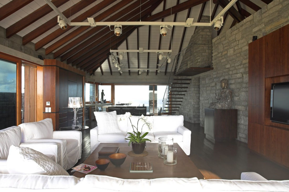 Situated high on a peninsula in Saint Barthélemy in the Caribbean, this luxury residence has spectacular 270 degree views of the ocean. Designed by Barnes Coy Architects, the house has a contemporary design with a Caribbean flair. Each bedroom opens to a private outdoor shower. The use of limestone wall and glass panels in the living area allows for seamless connection between the interior and the exterior spaces.
