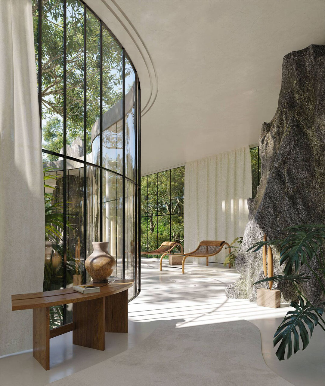 Inspired by the modernist architecture of Lina Bo Bardi, designers Charlotte Taylor and Nicholas Préaud have envisioned Casa Atibaia in a series of renderings of a modernist glass house nestled amongst the forested banks of the Atibaia River in São Paulo, Brazil.